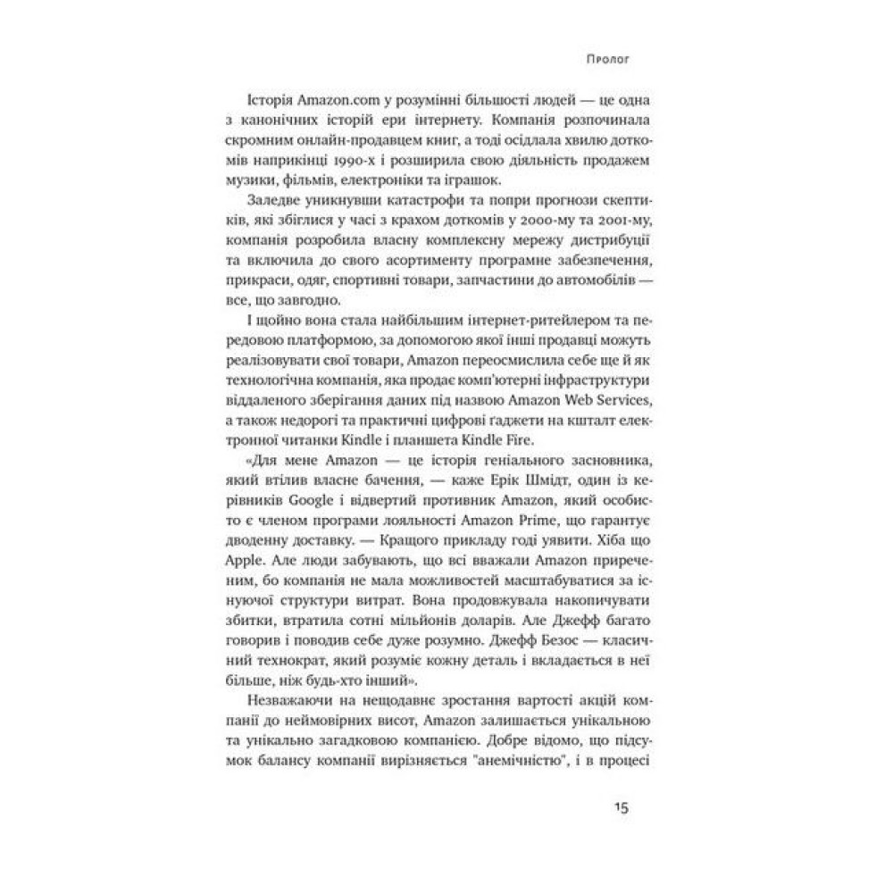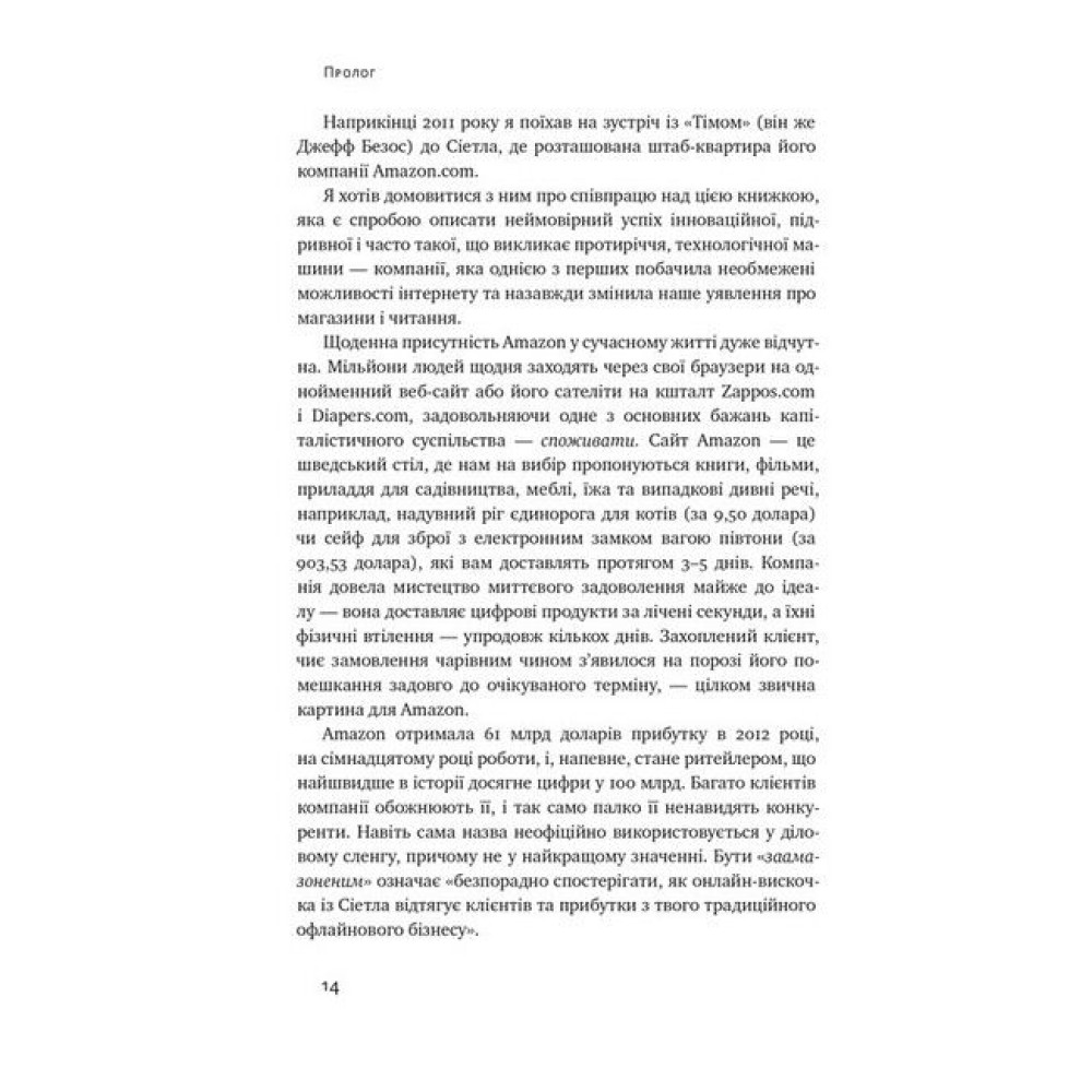 «Продається все. Джефф Безос та ера Amazon» — не лише історія успіху новаторської компанії, а й своєрідна інструкція для тих, хто хоче створити свій бізнес. Бред Стоун захопливо пише про зародження і розвиток Amazon — від часів створення компанії на Волл-стріт на початку 1990-х і дотепер. Стоун розкриває секрет успіху засновника Amazon Джеффа Безоса та детально розповідає, як він дисципліновано і подекуди педантично втілює новаторські ідеї у життя, ламає стереотипи і не визнає загальноприйнятих правил, запроваджуючи натомість свої.Під час написання цієї книги автор спілкувався з сотнями колишніх і теперішніх працівників Amazon, з рідними і друзями Джеффа Безоса. Такої ґрунтовної біографії компанії, що назавжди змінила те, як ми купуємо і читаємо, світ ще не бачив.Для широкого кола читачів, усіх, хто цікавиться історіями успішних компаній, інноваціями та бізнесом.Про автора:Бред Стоун — американський письменник і журналіст, який віддавна висвітлює події Кремнієвої долини та компанії Amazon зокрема. Оглядач видань Newsweek, New York Times та Bloomberg Businessweek.