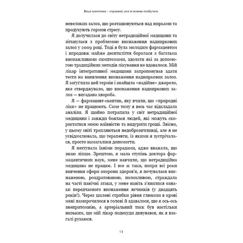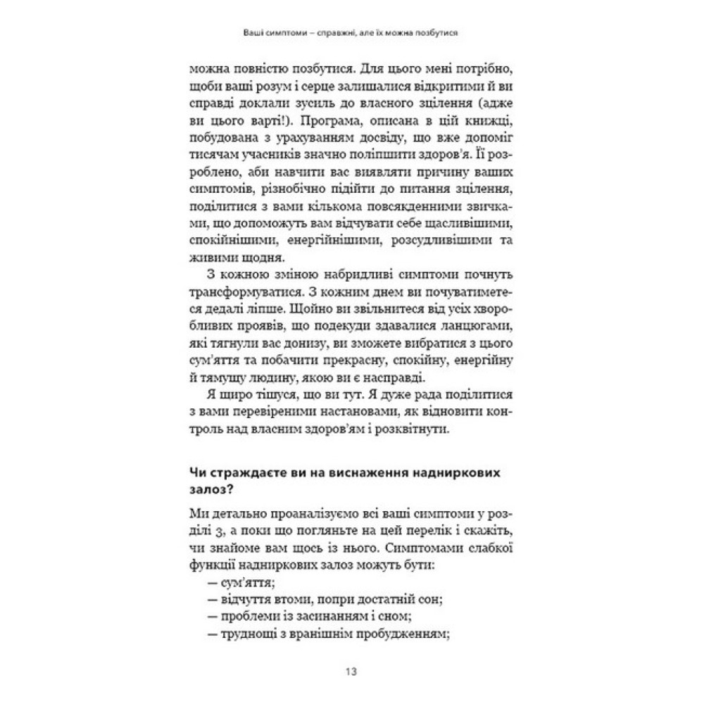 «Чим ви займалися у своєму житті до того, як захворіли?» Це запитання часто ставить своїм клієнтам доктор Ізабелла Венц, щоб з'ясувати першопричину їхніх симптомів: постійної втоми, відсутності енергії, залежності від кофеїну, безсоння, поганої пам’яті тощо. Найчастіше вона виявляє, що симптоми в цих людей з’явилися після періоду гострого чи хронічного стресу, який порушує роботу надниркових залоз. Вивчивши та узагальнивши численні дослідження й поєднавши їх із практичним досвідом, Ізабелла Венц розробила харчову програму, яка допомагає відновити ці важливі органи, урівноважити рівні гормонів, які відповідають за регулювання стресу, й ліпше долати виклики нашого життя.
