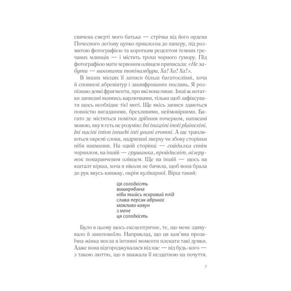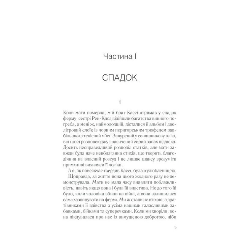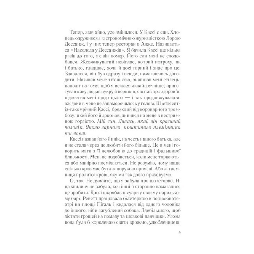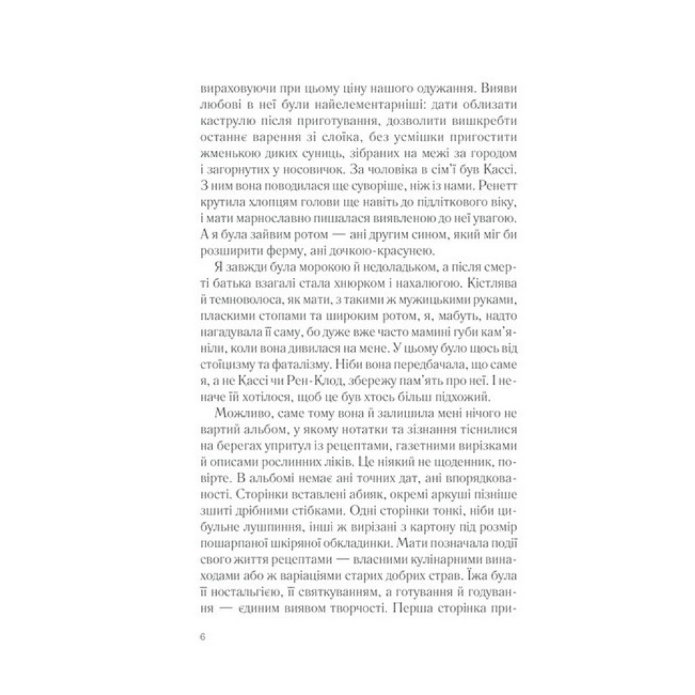 Найголовніше сховано всередині.Фрамбуаза отримала дивний спадок від матері. Її брату дісталася ферма, старшій сестрі — винний погріб, сповнений бурштиново-сонячних пляшок, а Фрамбуазі — альбом з кулінарними рецептами. Не багацько... Але на берегах зошита впереміш зі старовинними рецептами різноманітних смаколиків вона знаходить загадкові нотатки. Секрети та зізнання матері. Життя, яке вона так ретельно приховувала від дітей, у часи війни й окупації. Маленькі радощі й прикрощі, потаємні думки, дитячі образи та щира сповідь жінки, що боялася любити. Минуло стільки років. Лишилося стільки запитань. Відповіді на них — у цьому старому щоденнику. Настав час розкрити моторошні таємниці минулого.Від авторки мегапопулярного роману «Шоколад».