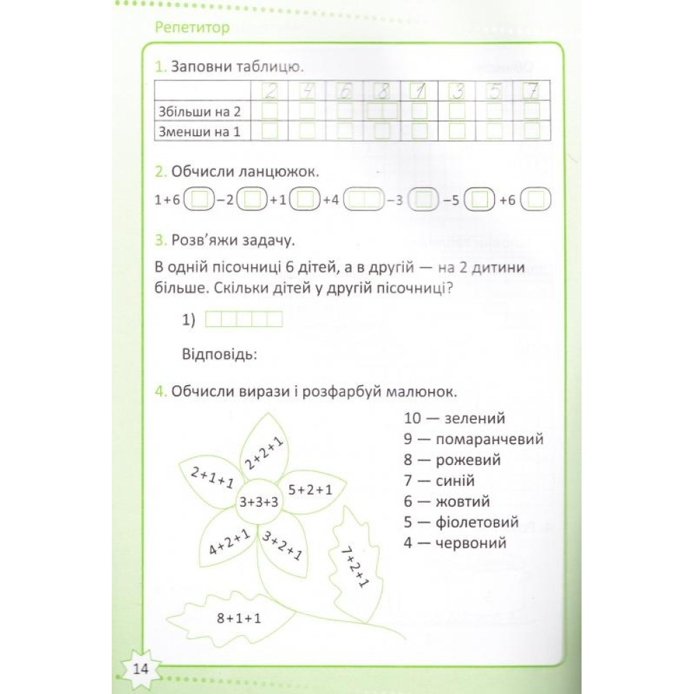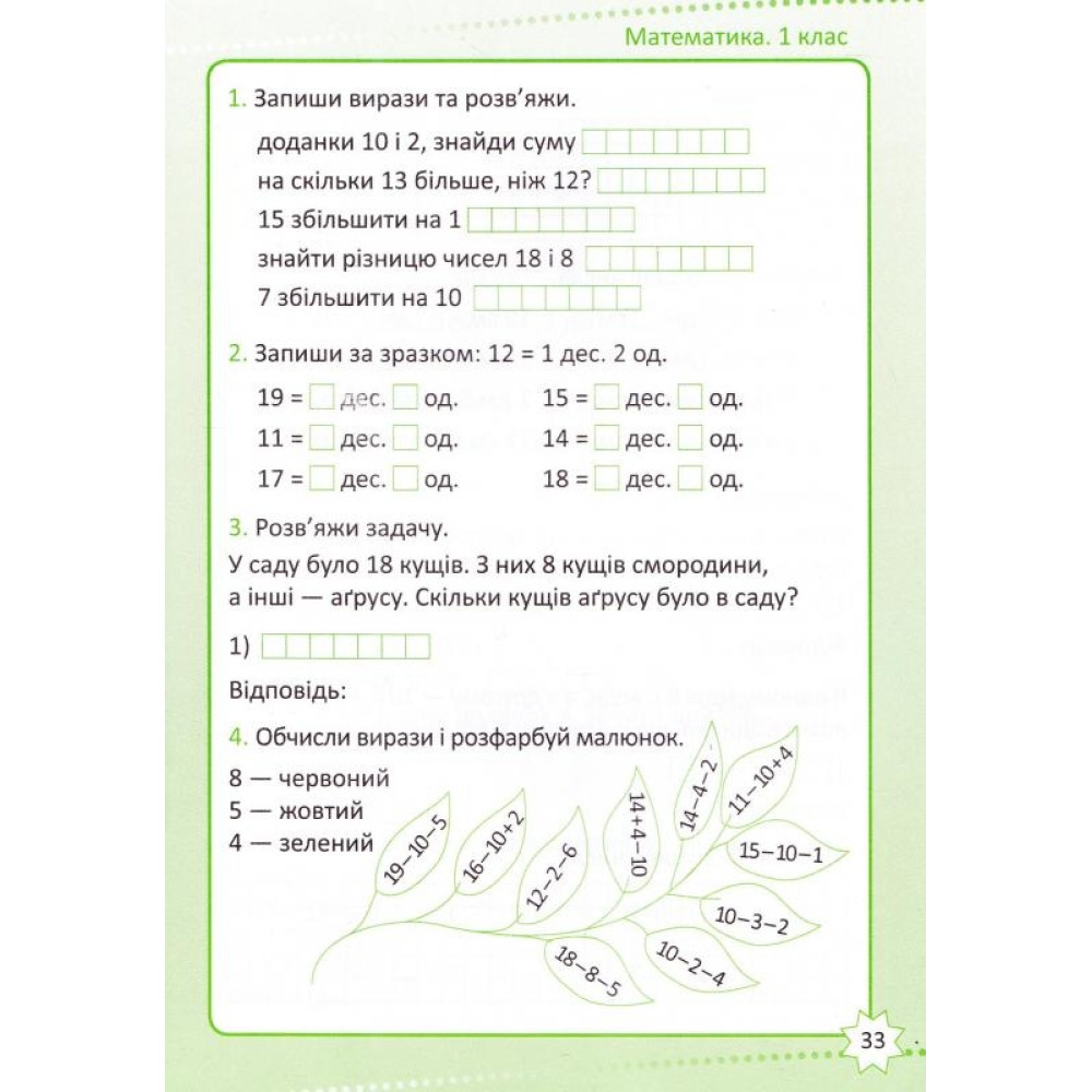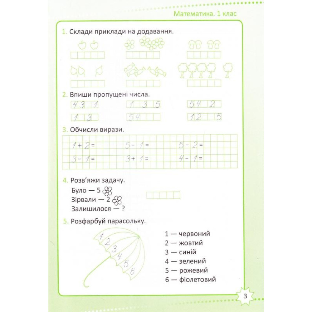 Посібник призначений для самостійної роботи учнів 1 класу. Він містить завдання, що сприяють доведенню засвоєних математичних знань та навичок до автоматизму; удосконаленню усного рахування, вміння розв'язувати задачі. Робота із зошитом організовує дитину, навчає самостійності. Крім того, посібник стане у пригоді вчителям початкової школи під час підготовки до уроків і перевірки результатів засвоєння матеріалу і небайдужим батькам, що прагнуть контролювати рівень знань дитини.