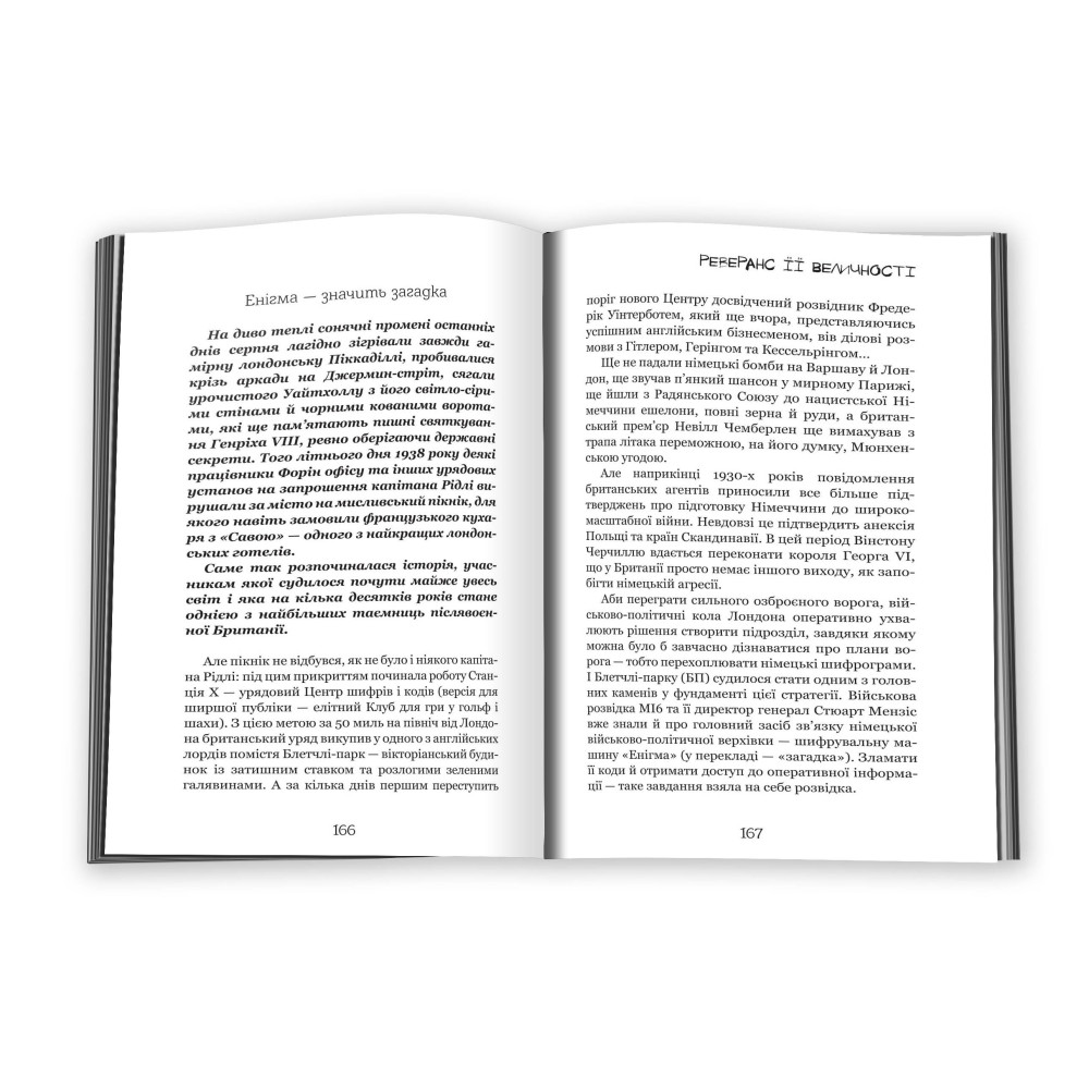 Книжка про Сполучене Королівство представляє відомих історичних і сучасних осіб Великої Британії – королеву Єлизавету ІІ, колишнього прем’єр-міністра сера Вінстона Черчилля, героя Ватерлоо герцога Веллінгтона. Відомі оксфордські професори – історик Норман Дейвіс, генетики Браян Сайкс та Стівен Оппенгеймер в ексклюзивних інтерв’ю розповідають про давню історію світу й України. А документальні історії про найбільш засекречений розвідувальний об’єкт часів Другої світової війни Блетчлі-парк, про долю винахідника першого в світі комп’ютера Алана Тюрінга та про колишнього розвідника, а згодом автора романів про Джеймса Бонда – Яна Флемінга для багатьох стануть справжнім відкриттям.