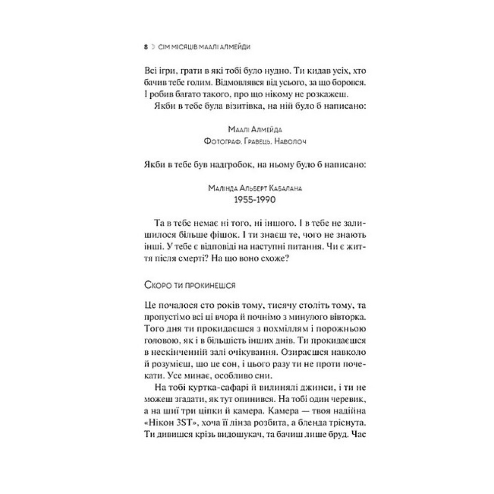 Коломбо, 1990 рік. Події розгортаються під час громадянської війни у Шрі-Ланці. Маалі Алмейда — воєнний фотограф та азартний гравець — прокидається у Міжсвітті, не пам’ятаючи обставин своєї смерті. Усе, що наразі відомо — його тіло розчленували та втопили в озері. Але навіть у потойбіччі час для чоловіка спливає. Маалі доведеться розкрити таємницю своєї загибелі та якось повідомити близьким, де зберігаються секретні фотографії, що мають змінити політичний світ Шрі-Ланки. Але як можна вплинути на події в реальному світі, якщо тебе вже не існує? Маалі Алмейда має тільки сім Місяців, щоб утілити всі задуми…