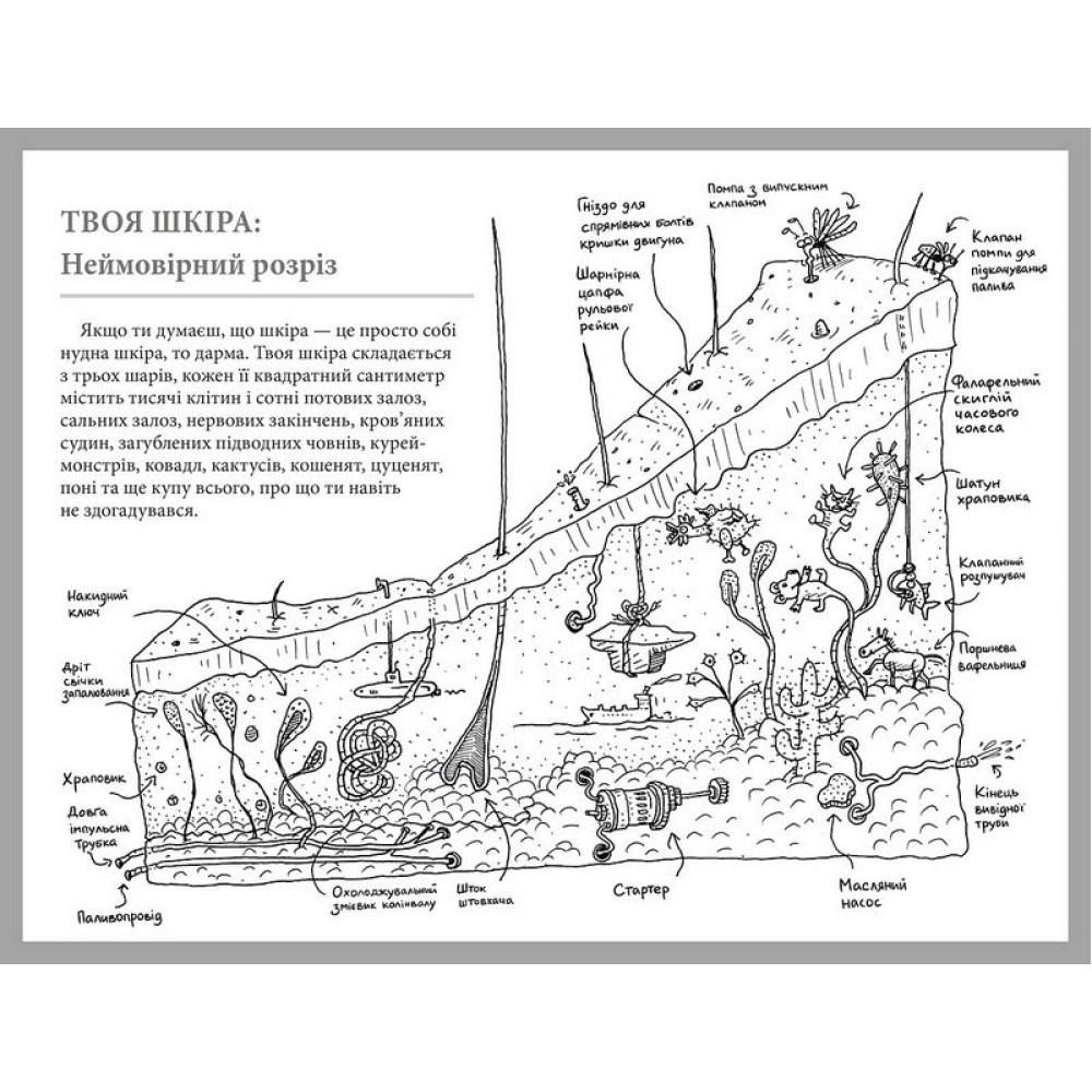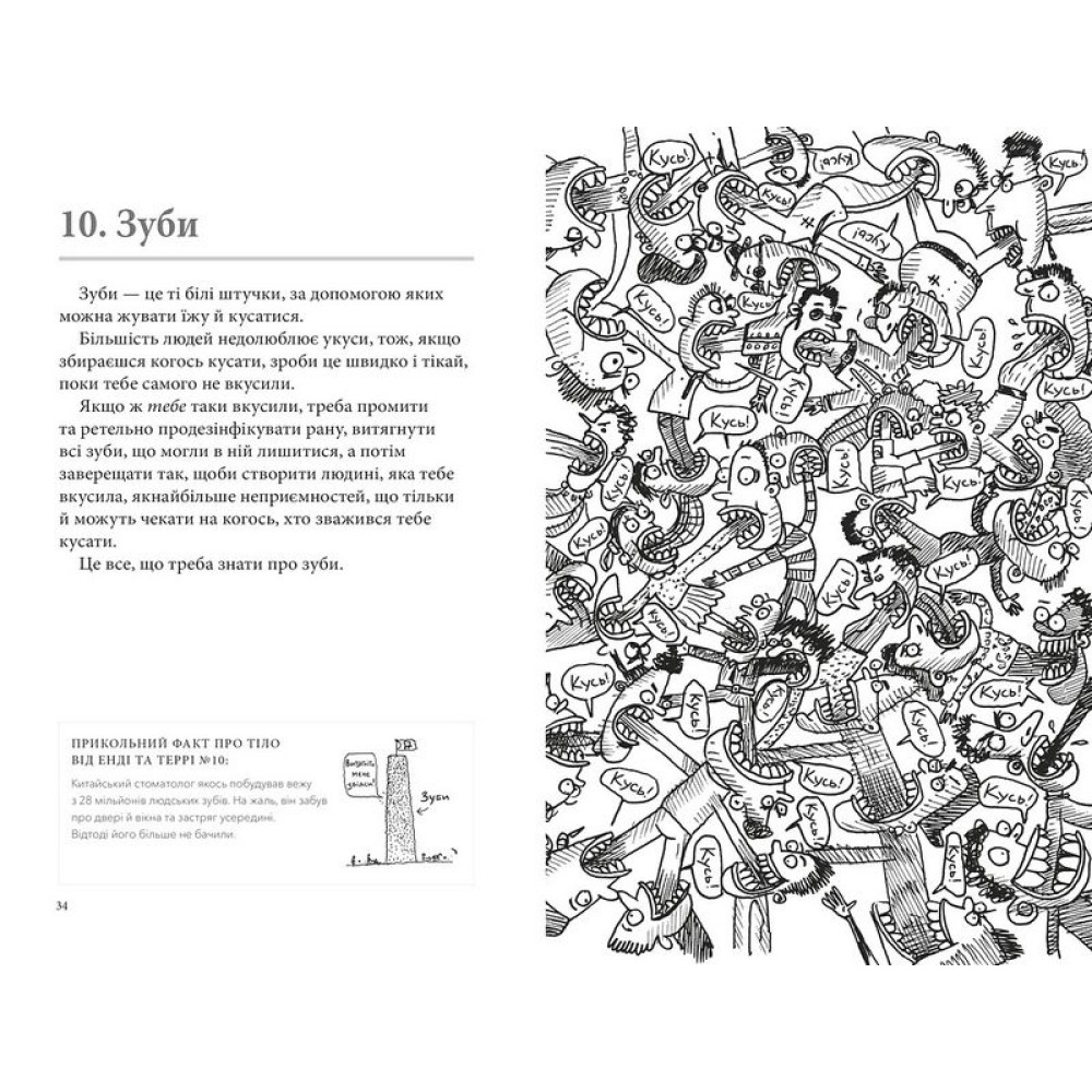 Про людське тіло написано багато дурні, і ця книжка не виняток! 68 ілюстрованих розділів без жодного правдивого факту розкажуть усе, що тобі хотілося б знати про своє тіло, і не втомлять сухою мовою та науковою достовірністю!В Енді Ґріффітса є тіло з 68 робочими частинами. Коли він не пише (руками), він любить читати (очима), думати (мозком), бігати (ногами), плавати (руками й ногами), дихати (носом, трахеєю та легенями), їсти (ротом із зубами, язиком і слиною), перетравлювати їжу (тонкою кишкою, товстою кишкою, жовчним міхуром, підшлунковою залозою, печінкою та селезінкою) і сидіти (на своїй дупі). Це все, що треба знати про Енді Ґріффітса.У Террі Дентона також є тіло. Воно вище, старше і красивіше за тіло Енді. Це все, що треба знати про Террі Дентона.