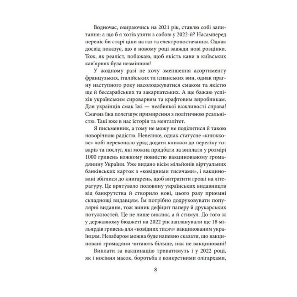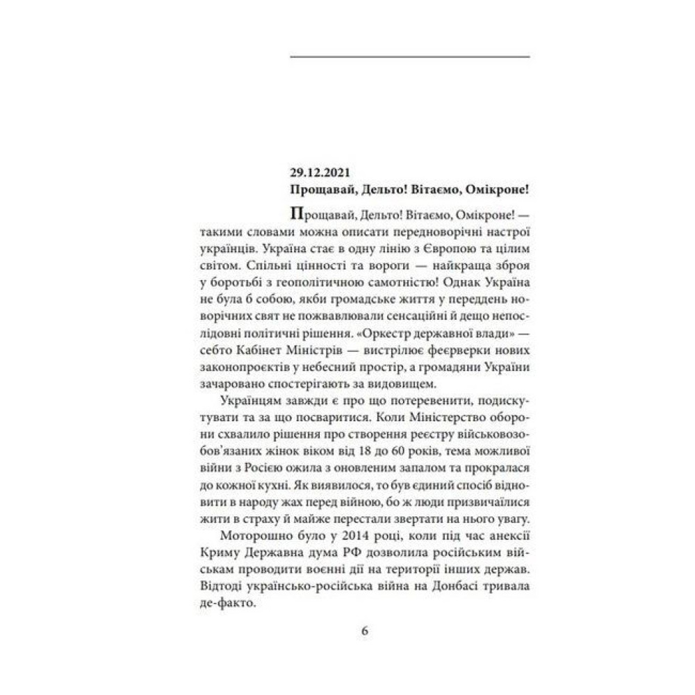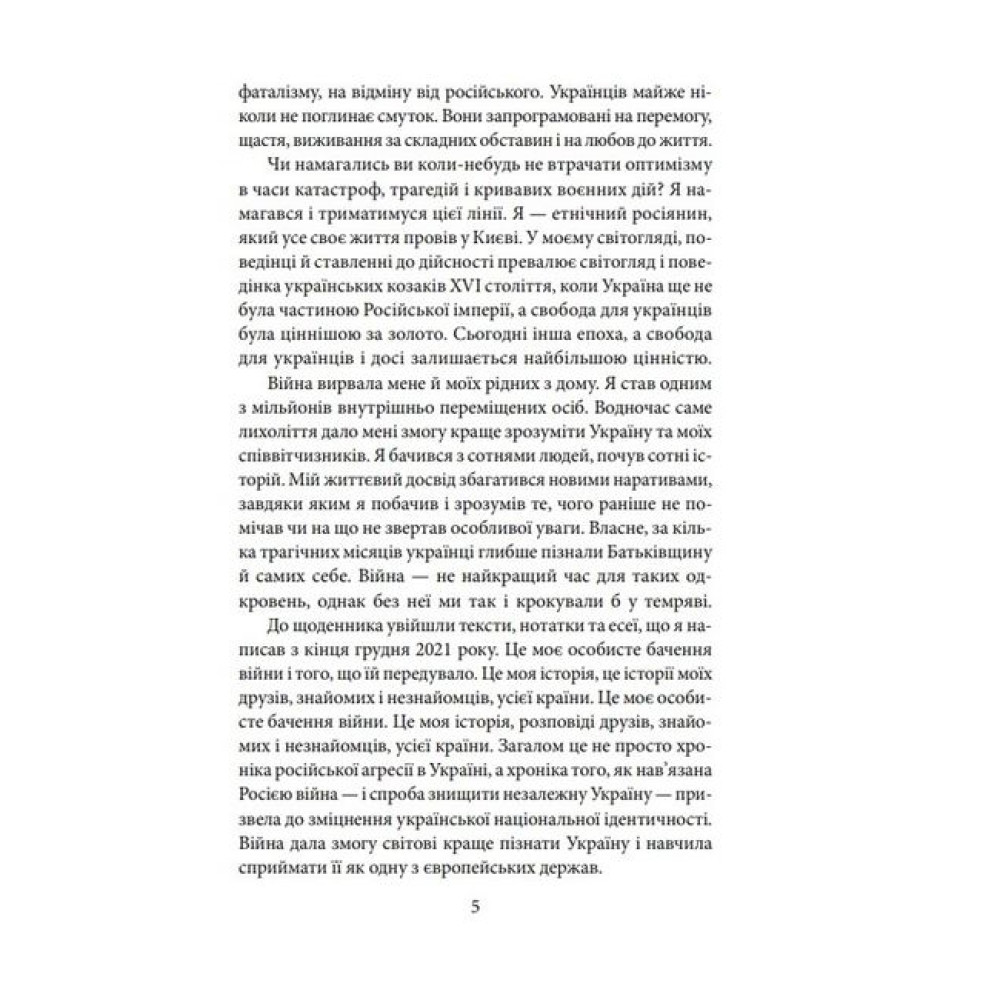 Двадцять четвертого лютого 2022 року письменник Андрій Курков нічого не написав. І в наступні кілька днів теж. Етнічному росіянинові, який усе своє життя провів у Києві, загрожувала така сама небезпека, як і решті українців. Бо в його світогляді, поведінці й ставленні до дійсності превалює світогляд і поведінка українських козаків XVI століття, коли Україна ще не була частиною Російської імперії, а свобода для українців була ціннішою за золото.Війна вирвала письменника з рідного київського дому й зробила одним з мільйонів внутрішньо переміщених осіб. Він відкрив ноутбук тільки в Ужгороді, щоб відшукати передчуття війни у текстах, написаних за останні два місяці. І знайшов більше, ніж очікував. Вони, а також воєнні нотатки й есеї, стали щоденником, який розповідає про його особисте бачення війни. Письменник каже, що це «не просто хроніка російської агресії в Україні, а хроніка того, як нав’язана Росією війна – і спроба знищити незалежну Україну – призвела до зміцнення української національної ідентичності. Війна дала змогу світові краще пізнати Україну і навчила сприймати її як одну з європейських держав».