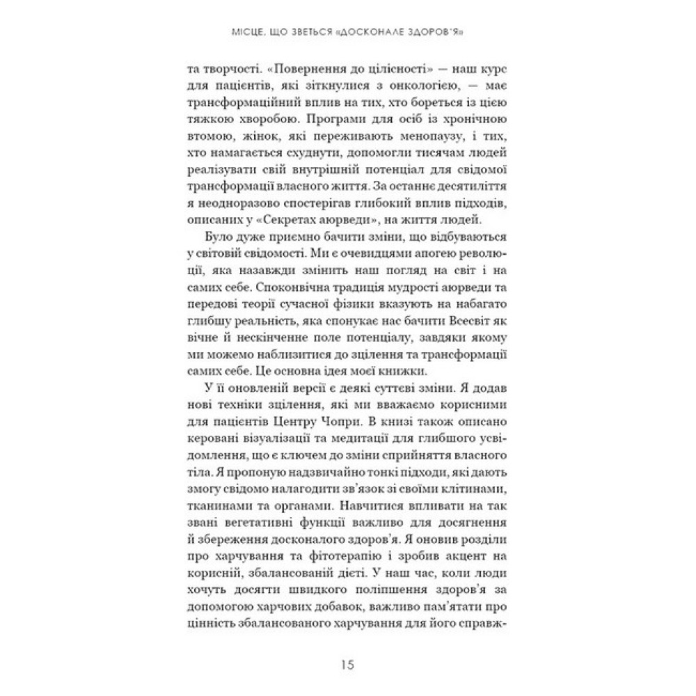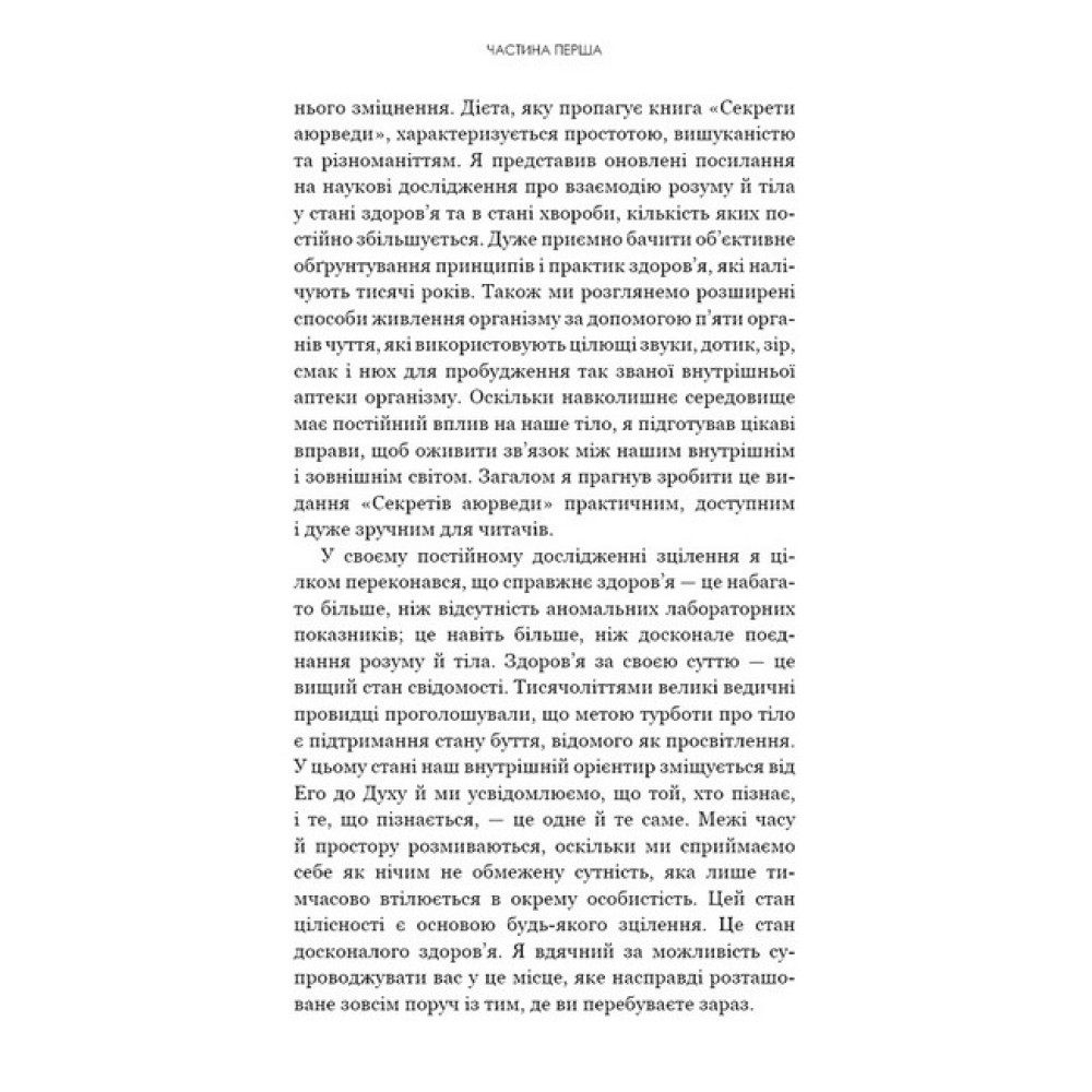 Аюрведа — це медична система стародавньої Індії, яка налічує вже понад 5000 років і підтверджена сучасними дослідженнями. Книга Діпака Чопри — оригінальний посібник із застосування стародавньої мудрості аюрведи в повсякденному житті. Автор пропонує повну покрокову програму лікування розуму й тіла, адаптовану до індивідуальних потреб, які визначаються за допомогою тесту. Вона допоможе відновити основний баланс тіла та рівновагу з природою, зміцнити зв'язок розуму та тіла й використовувати силу квантового зцілення, щоб подолати хвороби та старіння.