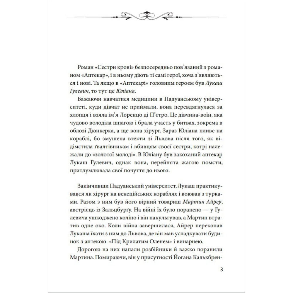 Події роману «Сестри крові» розвиваються в Ґданську, на українському корсарському кораблі «Стрибог», який полює на іспанські ґалеони, та, звичайно, у Львові. Діють в ньому здебільшого ті самі герої, що й в романі «Аптекар», хоча з'явилися й нові. Однак якщо в «Аптекарі» головним героєм був лікар Лукаш Гулевич, то тут – Юліана, яка переодяглася на хлопця Лоренцо, щоб помститися вбивцям своєї сестри.