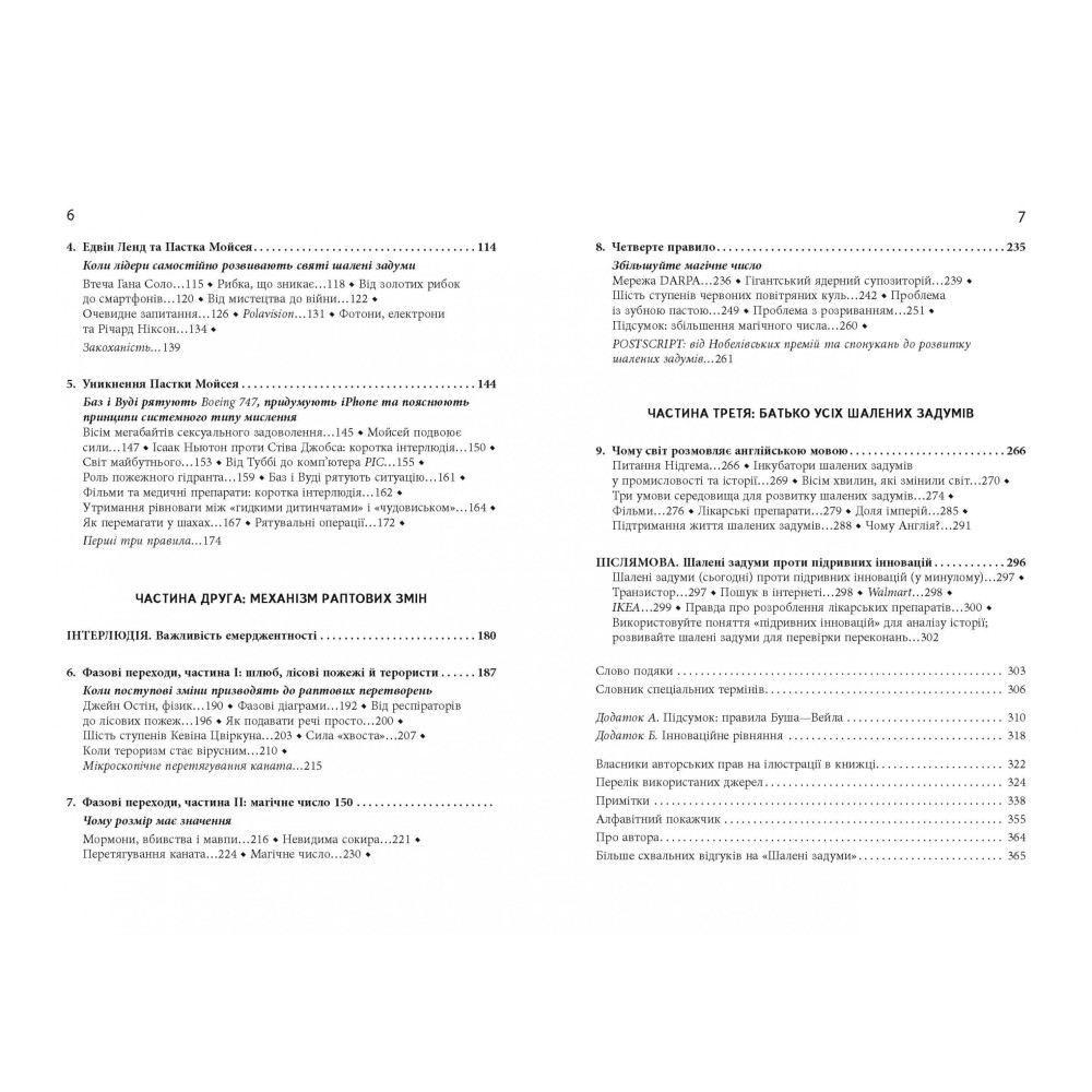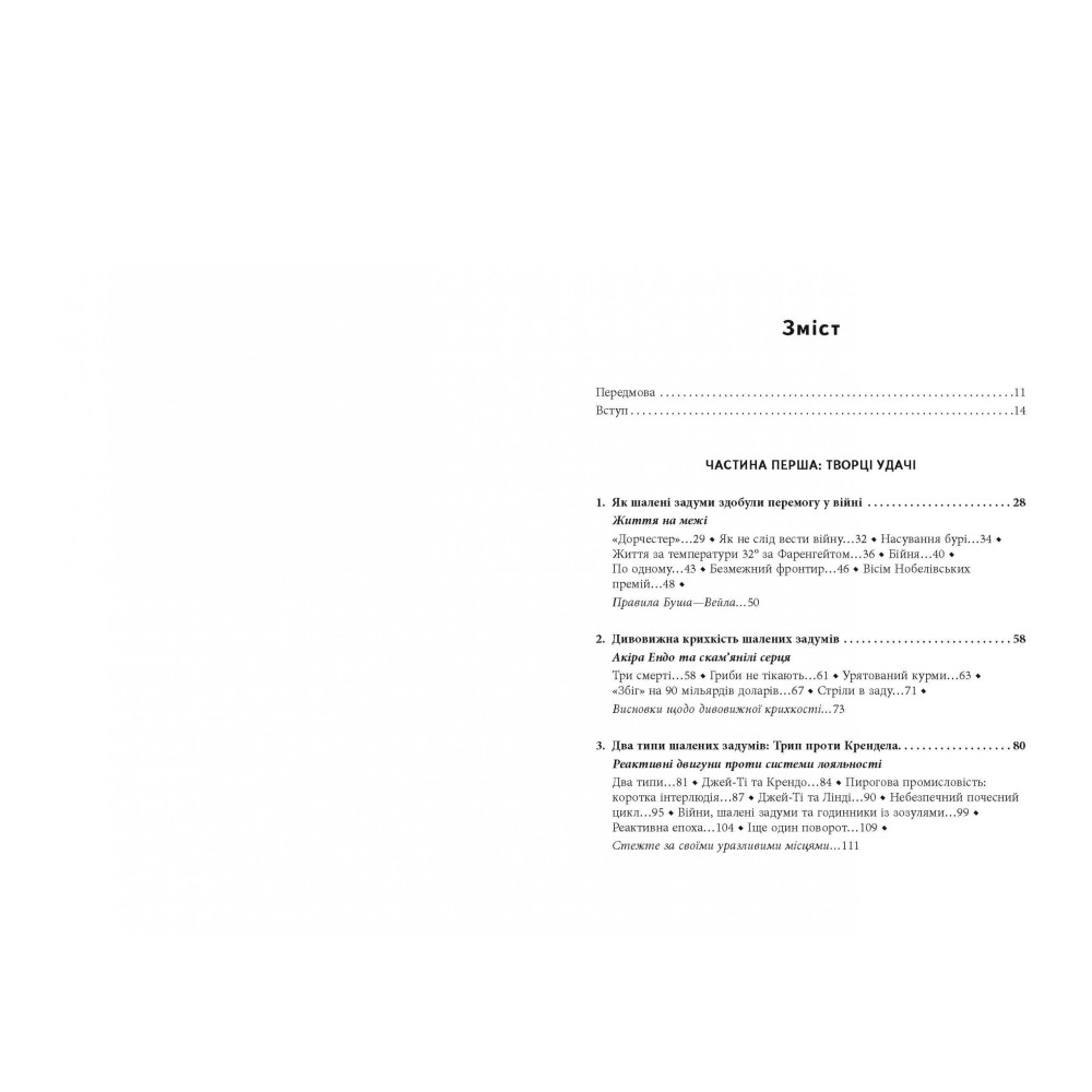 ПРО КНИГУУ своїй книжці «Шалені задуми» фізик та підприємець Сафі Бакал розкриває читачам дивовижний новий підхід до сприйняття групової поведінки, який піддає сумнівам усі наші попередні уявлення щодо розвитку радикальних проривів у науці й промисловості. Спираючись на наукові принципи явища фазового переходу, Бакал пояснює, чому команди, компанії та будь-які інші групи певного призначення можуть раптово змінювати свою поведінку від прийняття нових несамовитих ідей до рішучого їх відторгнення, так само як текуча вода може перетворюватися на твердий лід. Використовуючи приклади, що варіюються від поширення лісових пожеж до полювання на терористів у соцмережах, та принагідно розповідаючи історії про злодіїв, геніїв та королів, Бакал демонструє, як саме ця нова наукова сфера може допомогти нам розуміти причини поведінки компаній та занепаду імперій. «Шалені задуми» перетворюють ці знання на уроки для творчих спеціалістів, підприємців та інших далекоглядних людей у всіх сферах нашого життя.ПРО АВТОРАСафі Бакал здобув диплом бакалавра з відзнакою за спеціальністю «Фізика» у Гарвардському університеті та захистив дисертацію доктора філософії у Стенфордському університеті. Пропрацювавши три роки консультантом у компанії McKinsey, він став засновником біотехнологічної компанії із розробки нових лікарських препаратів від раку. Він особисто проводив первинну публічну пропозицію компанії та упродовж 13 років перебував на посаді її генерального директора. У 2008 році Сафі Бакала оголосили Підприємцем року у галузі біотехнологій за версією компанії Ernst & Young. У 2011 році він співпрацював із радою наукових консультантів президента Обами з питань майбутнього національних досліджень.Наразі Сафі Бакал працює із гендиректорами та управлінськими групами різних компаній щодо питань стратегії та інновацій.