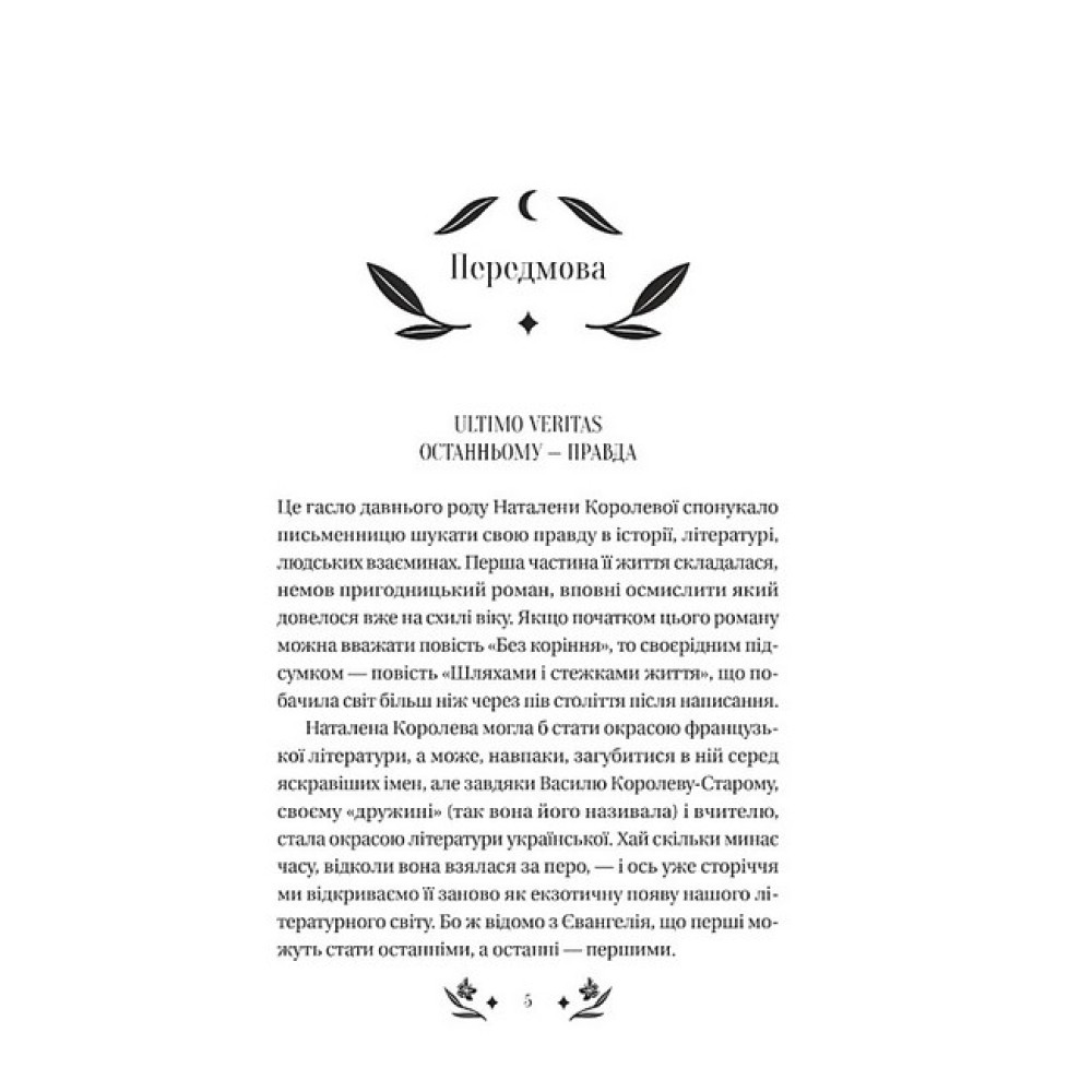 Ім’я Наталени Королевої оповито легендами й загадками. Письменниця не залишила нам жодних документів — лише неймовірну автобіографію та художні твори, які називала «життєписом». До таких належить і «Без коріння» — повість із життя вихованок Київського інституту шляхетних дівчат. Головна героїня, чужинка, уважно придивляється до всього довкола неї і вловлює те, що ховається від інших. У цьому екзотичному коктейлі є і роман виховання, і тонкий психологізм, і київські реалії початку ХХ століття, і ностальгія за юністю. Спробуйте скуштувати і визначити, скільки серед його інгредієнтів правди й легенди, — ось вам загадка, яку залишила Королева. Книга «Шовкова пані» — це збірка припорошеної містикою автобіографічної короткої прози Наталени Королевої. Твори класичної української літератури занурюють читача у світ, де реальність переплітається з уявним, а життя і смерть стають нероздільними супутниками. Письменниця майстерно вводить елементи тонкого психологізму та європейської художньої традиції до своїх напрацювань, чим створює унікальний простір, де панують загадковість і таємничість. У книзі «Шовкова пані» Наталена Королева веде читача похмурими коридорами, в них чується шелест шовкових суконь і зустрічаються тіні минулого. Головна героїня, неначе слідчий в пошуках відповідей, блукає між примарними спогадами та реальністю. Її спостережливість та вразливість до навколишнього світу дозволяють спіймати тонкі межі між буттям і небуттям, що відбиваються у її спілкуванні із загадковими персоналіями.