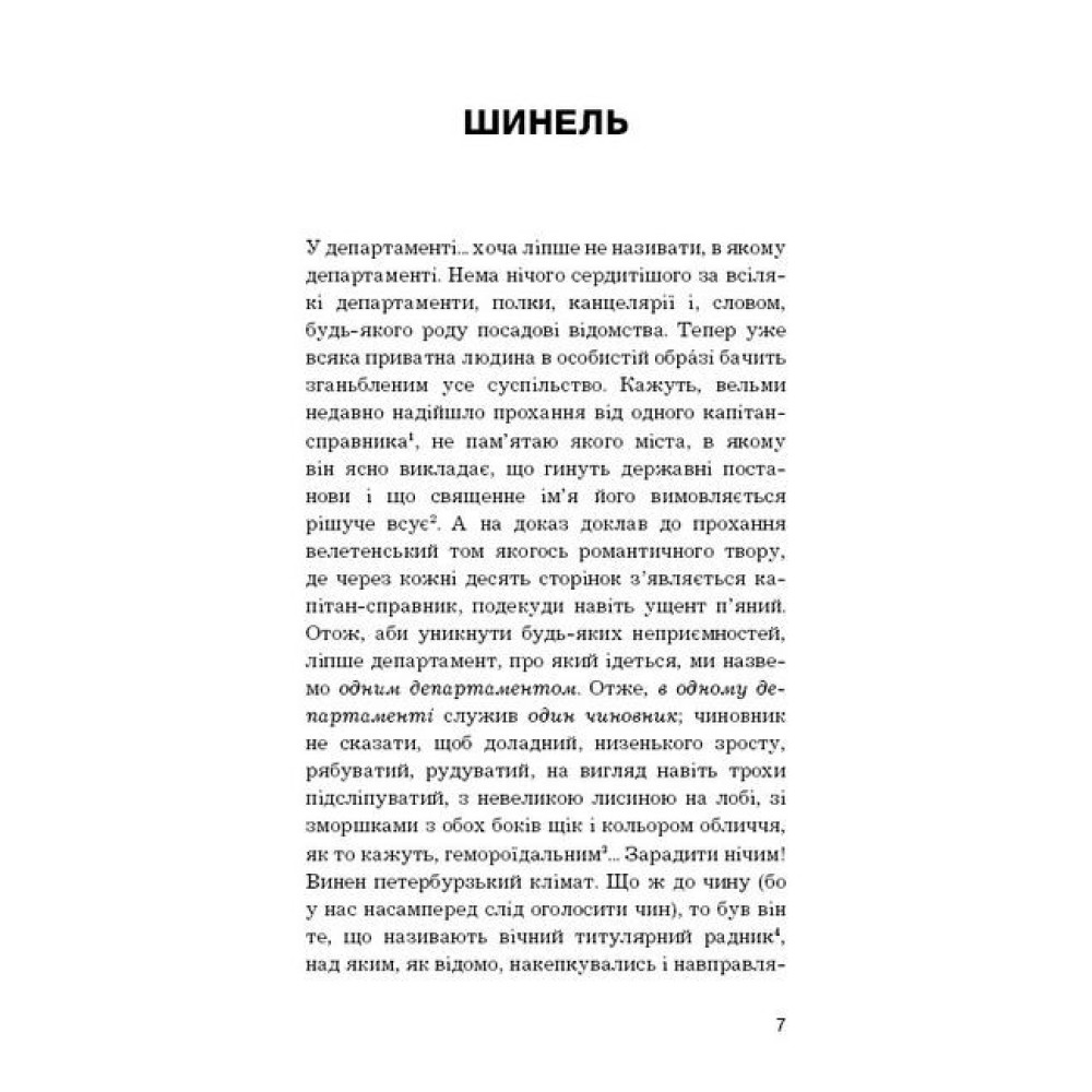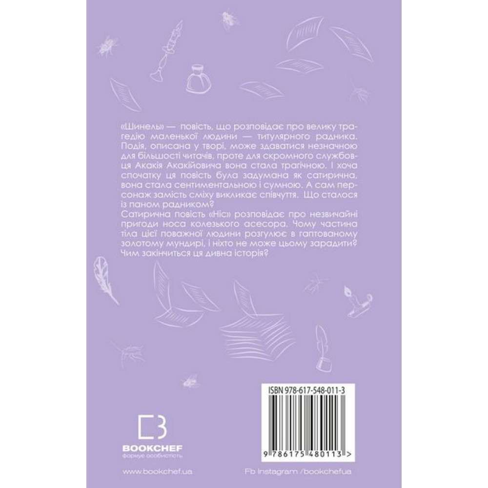 «Шинель» — повість, що розповідає про велику трагедію маленької людини — титулярного радника. Подія, описана у творі, може здаватися незначною для більшості читачів, проте для скромного службовця Акакія Акакійовича вона стала трагічною. І хоча спочатку ця повість була задумана як сатирична, вона стала сентиментальною і сумною. А сам персонаж замість сміху викликає співчуття. Що сталося з паном радником?Сатирична повість «Ніс» розповідає про незвичайні пригоди носа колезького асесора. Чому частина тіла цієї поважної людини розгулює в гаптованому золотому мундирі, і ніхто не може цьому зарадити? Чим закінчиться ця дивна історія?