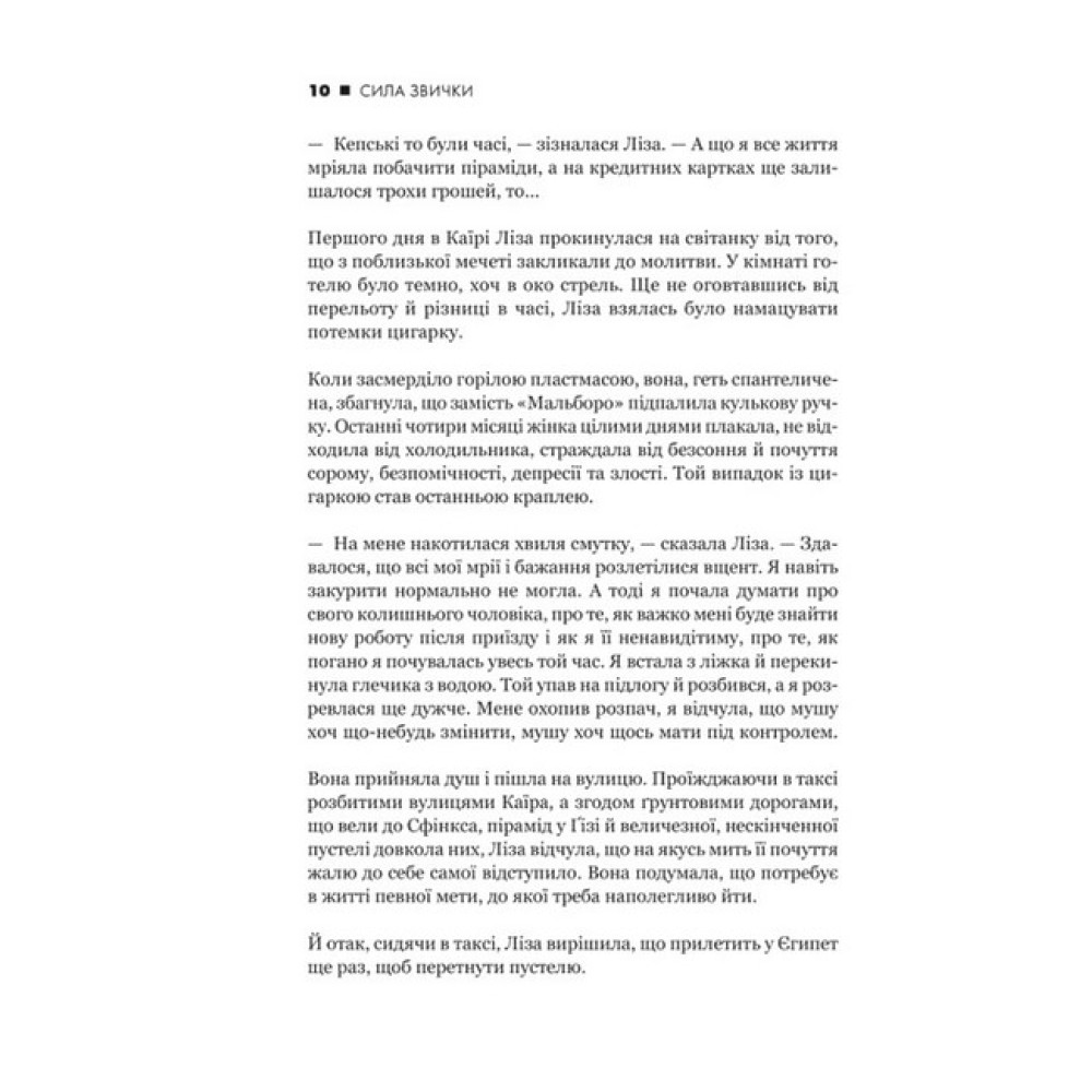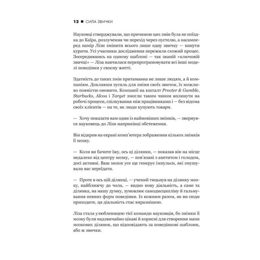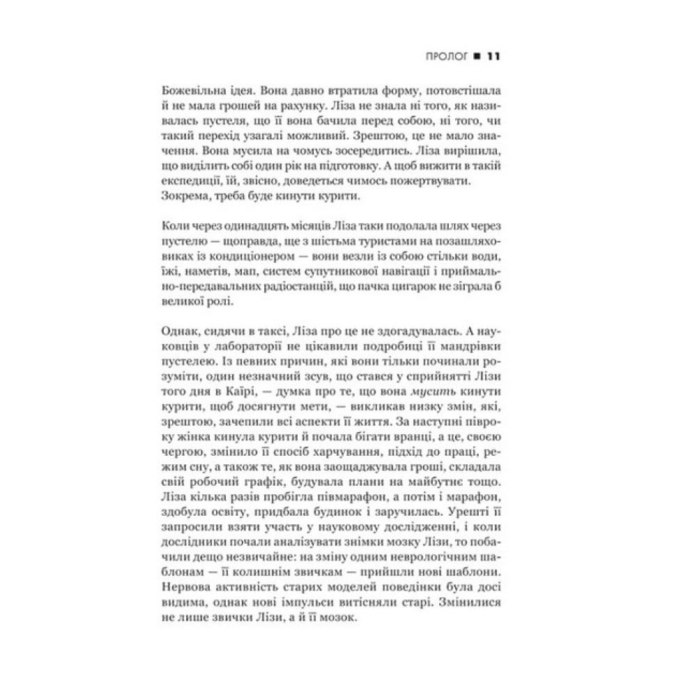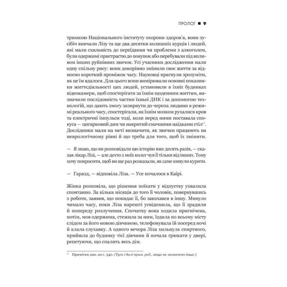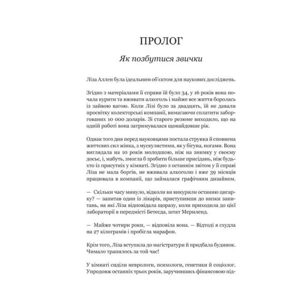 Перевидання в оновленому оформленніАвтор – лауреат Пулітцерівської преміїПонад 60 тижнів у списку бестселерів The New York TimesВходить до довгого списку рейтингу Financial Times Як звички впливають на життя? Як, змінивши лише один шаблон поведінки, різні люди змогли досягти успіху: стати директором, придбати будинок, пробігти марафон? В основу цієї книжки лягли інтерв’ю із трьома сотнями науковців і директорів підприємств, дослідження, проведені в десятках компаній. Проаналізувавши все це, автор зрозумів, як кожна людина може контролювати свої звички, щоб досягти успіху. Дізнавшись, як створюються та руйнуються звички, ви зможете перебудувати шаблони поведінки, як собі забажаєте. Ви зрозумієте, як змусити себе не палити, менше їсти, займатися спортом, не кричати на близьких, ефективніше працювати.