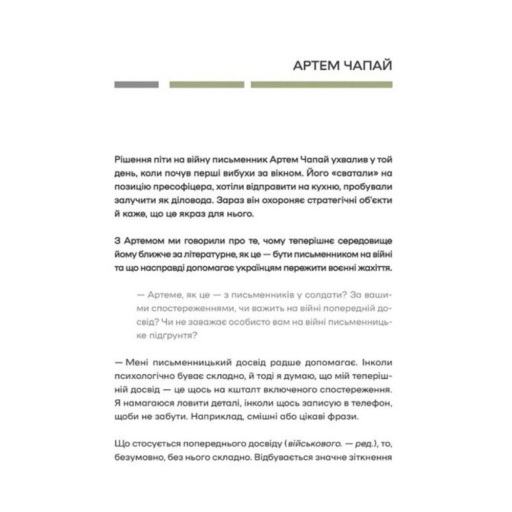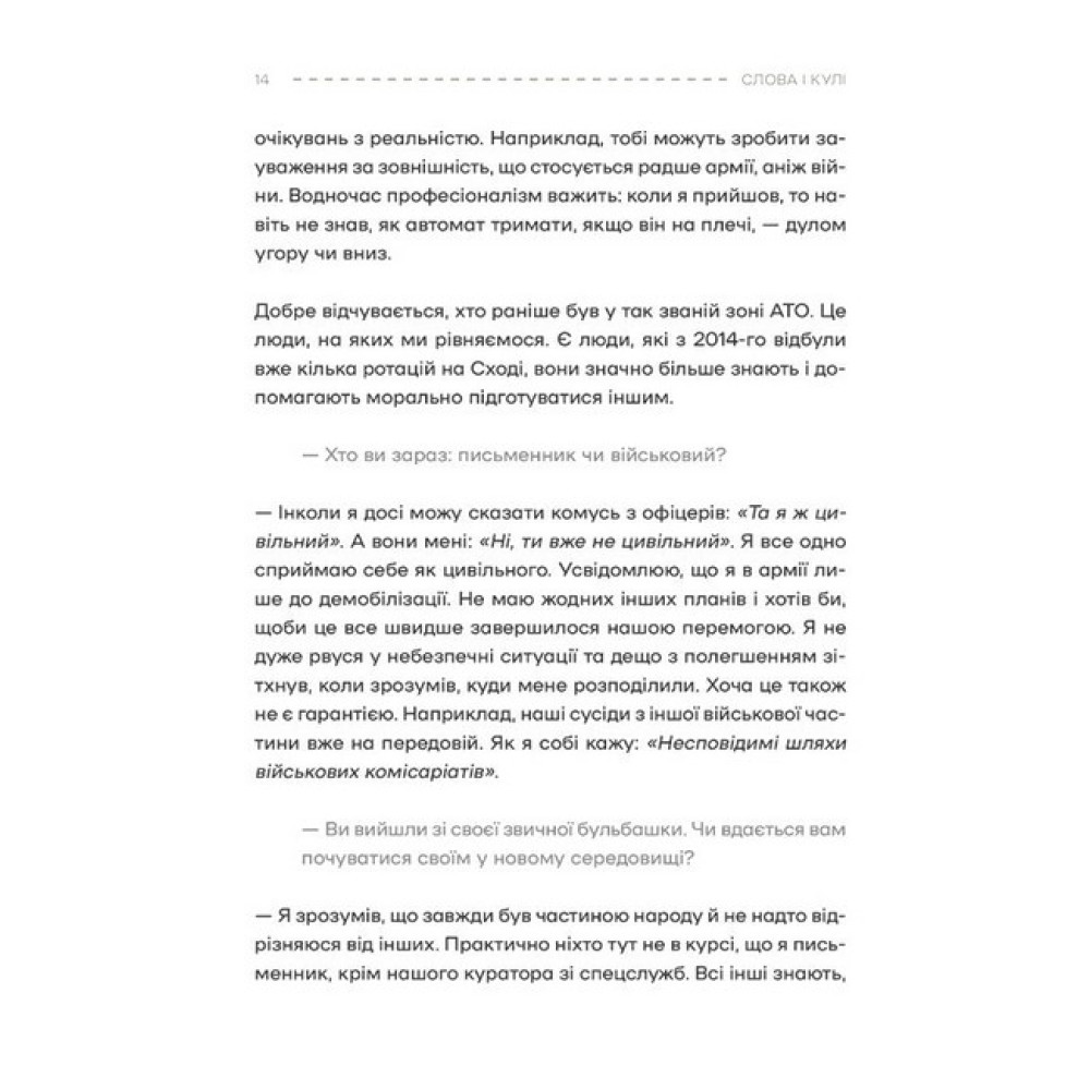 З початком повномасштабної війни Росії проти України сотні українських письменників і журналістів долучилися до Збройних сил або взялися за активну волонтерську роботу для забезпечення армії. Ті, хто звик змінювати світ текстами, були змушені стати на захист своєї країни. «Слова і кулі» — це розмови з людьми, які роками творили український літературний процес і розвивали українську журналістику, а тепер перетворилися з оповідачів на суб’єктів історій – тих, хто оберігає наше теперішнє й робить можливим наше майбутнє. До книжки входить 24 інтерв'ю: Артем Чапай, Дмитро Крапивенко, Галина Крук, Анатолій Дністровий, Олексій Сінченко, Вікторія Амеліна, Андрій Любка, Богдан Коломійчук, Валерій Пузік, Петро Яценко, Ігор Мітров, Ярина Чорногуз, Катерина Міхаліцина, Євгенія Подобна, Максим Кривцов, Максим Скубенко, Тетяна Огаркова та Володимир Єрмоленко, Павло Стех, Сергій Шебеліст , Павло Вишебаба, Дмитро Лазуткін , Леся Ганжа, Федір Шандор, Олександр Михед.Проєкт «Слова і кулі» з’явився з ініціативи культурновидавничого медіа «Читомо» та Українського ПЕН і став можливим за сприяння Національного фонду на підтримку демократії (NED). Передмову «Такі, як були. Зовсім інакші» написав для видання Сергій Жадан.