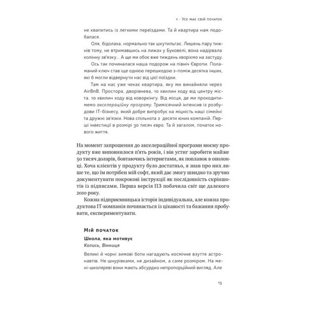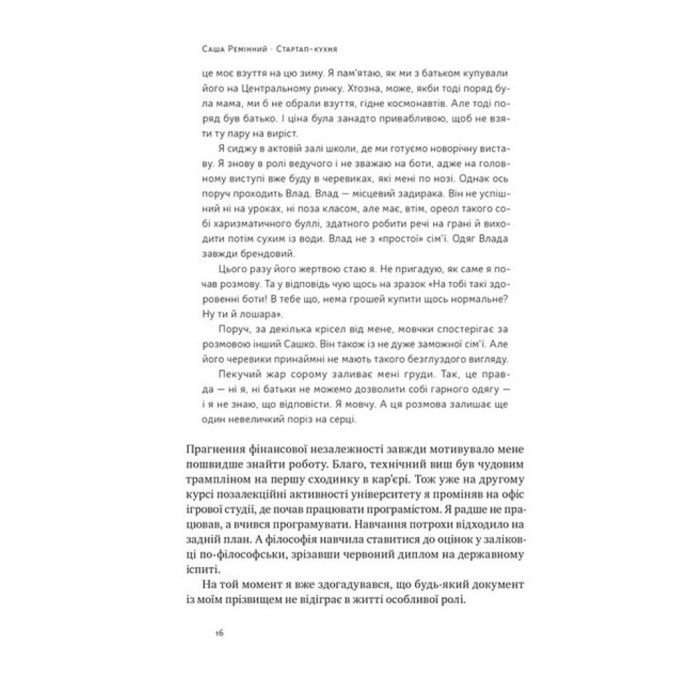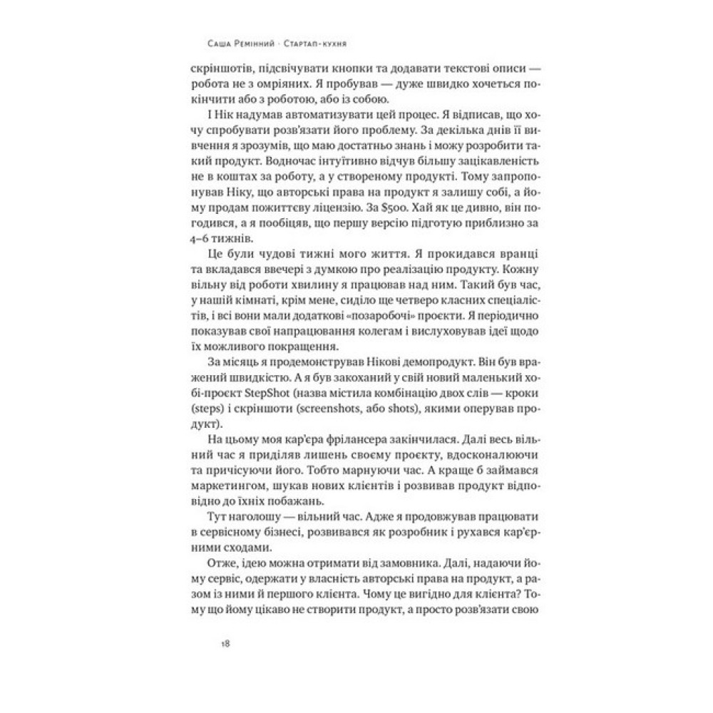 Як валідувати свою ідею? Де юридично оформити стартап? Що прописати у договорі з співзасновниками? Коли залучити першого найманого працівника? Яку зарплату виплачувати собі? Як залучити кошти від того омріяного інвестора? Ця книжка — написаний людською мовою посібник про те, як створити технологічний стартап саме в Україні, в наших повсякденних реаліях. Це особиста історія автора, де всі прийоми та приклади оживають. Це коментарі від інших засновників стартапів про їхній досвід. Автор має на меті також поділитись з вами тим, про що не часто пишуть у книгах. Про особисту мотивацію. Про внутрішні переживання. Про конфлікти між колегами. Про те, що ви могли би почути за чашкою запашного чаю у відвертій розмові на його кухні — Стартап-кухні. ДЛЯ КОГО ВИДАННЯ «СТАРТАП-КУХНЯ» Книжка стане незамінним помічником для тих, хто лише починає власну справу, а також для всіх підприємців і бізнесменів. ЧОМУ ЦЯ КНИЖКА У книжці описані кращі практики побудови стартапів, які автор для себе відкривав роками, і які він підсумував тут, щоб ви могли ними скористатися значно швидше на своєму шляху. ПРО АВТОРА Саша Ремінний — кандидат технічних наук, у минулому програміст, консультант, і зрештою — засновник успішного стартапу StepShot. Після продажу своєї компанії завжди був захоплений ідеєю поширення стартап досвіду задля навчання нового покоління технологічних підприємців. Тому, віднедавна — викладач з ІТ підприємництва Львівської політехніки, автор однойменного подкасту Стартап-кухня, ментор та радник у сфері B2B SaaS проєктів.