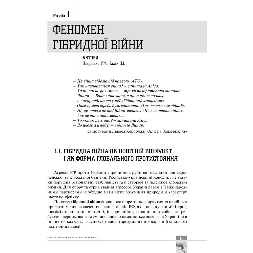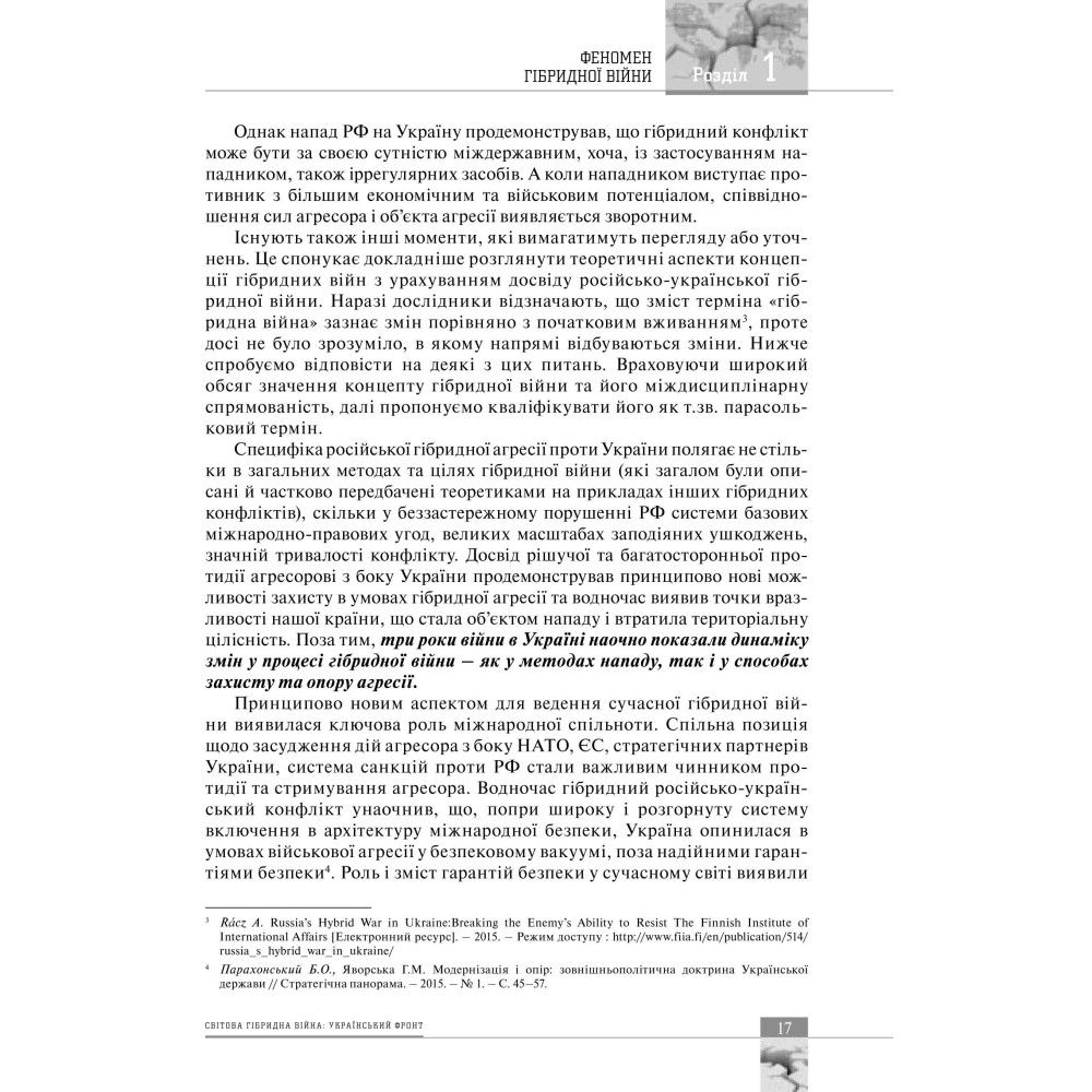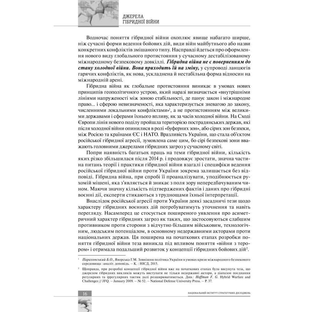 У колективній монографії, підготовленій фахівцями Національного інституту стратегічних досліджень, вперше у вітчизняній та світовій науці детально досліджено явище світової гібридної війни в перспективі російської агресії проти України. Сутність гібридної війни розглянуто у контексті системної кризи світової безпеки, а її феномен – як новітній вид глобального протистояння. Детально розглянуто причини та передумови російської агресії проти України, її стратегічні цілі, а також особливості ведення гібридної війни у різних вимірах: воєнному, політичному, економічному, соціальному, гуманітарному, інформаційному. Аналізуються локальні успіхи нашої держави у протидії ворожим планам РФ за окремими напрямами. Зроблено загальний висновок про доведення Україною своєї спроможності як держави, що відстоює свій суверенітет у боротьбі з агресором. Розглянуті питання реформування міжнародних безпекових інститутів та пошуку балансу сил у новій, гібридній реальності.