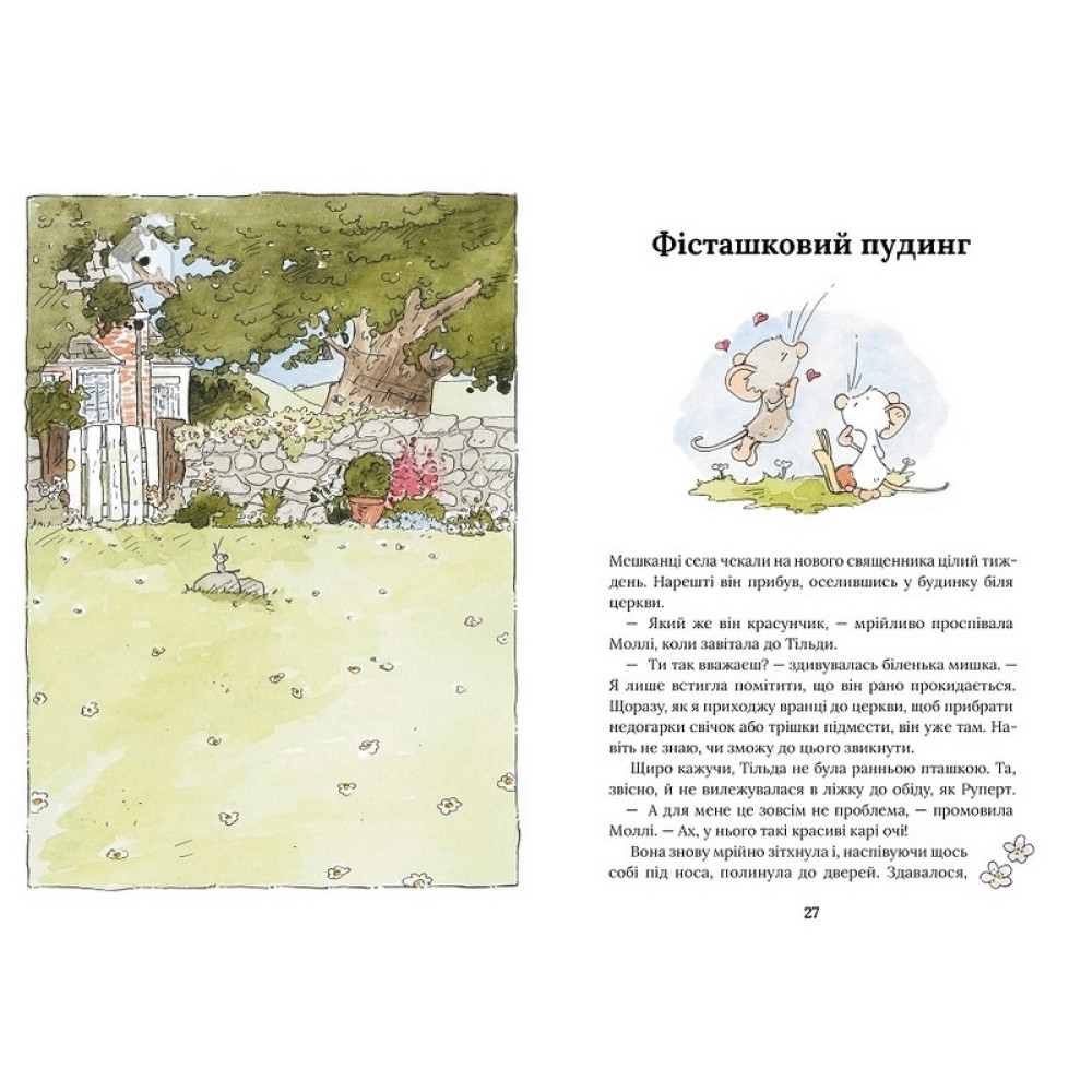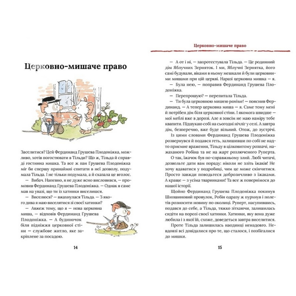 Чудові, затишні та атмосферні історії для дітей з милими ілюстраціями. Усі мешканці села поміж пагорбів приголомшені: їхній старий священник пішов на пенсію! А з новим панотцем приїхала і нова церковна миша - Фердинанд Грушева Плодоніжка. Фердинанд вимагає, щоб Тільда звільнила для нього свою затишну хатинку. Та друзі не збираються миритись із цим нахабством. Бо Шипшиновий провулок не можна уявити без Тільди Яблучне Зернятко! А отже, дуже скоро друзі зберуться за столом у її будиночку, щоб скуштувати фісташковий пудинг за секретним сімейним рецептом. Приєднуйтесь до частування у Шипшиновому провулку і ви - тут завжди смачно, затишно і дуже цікаво.