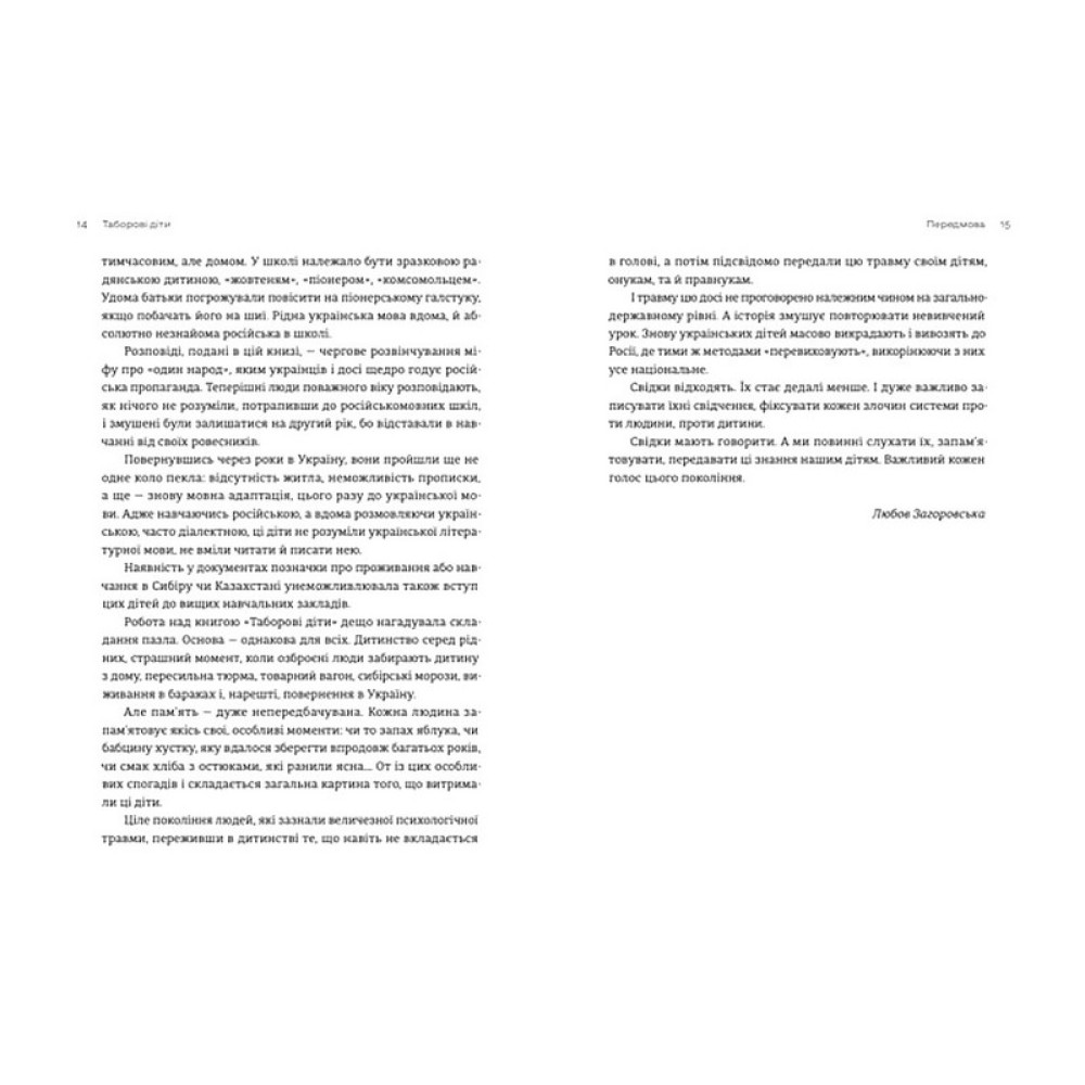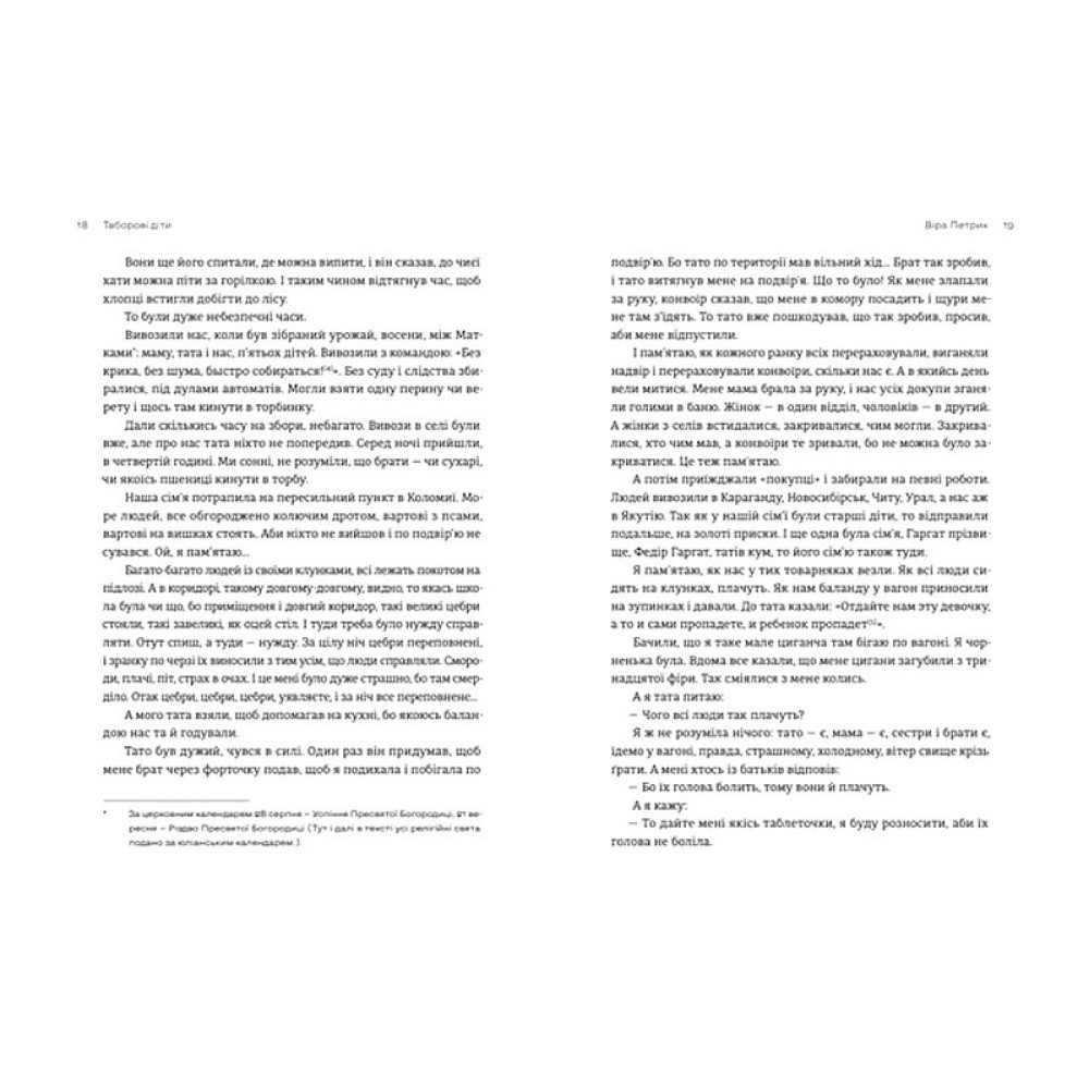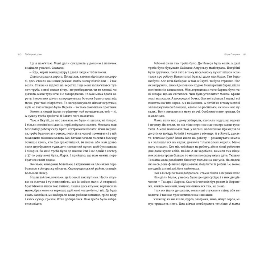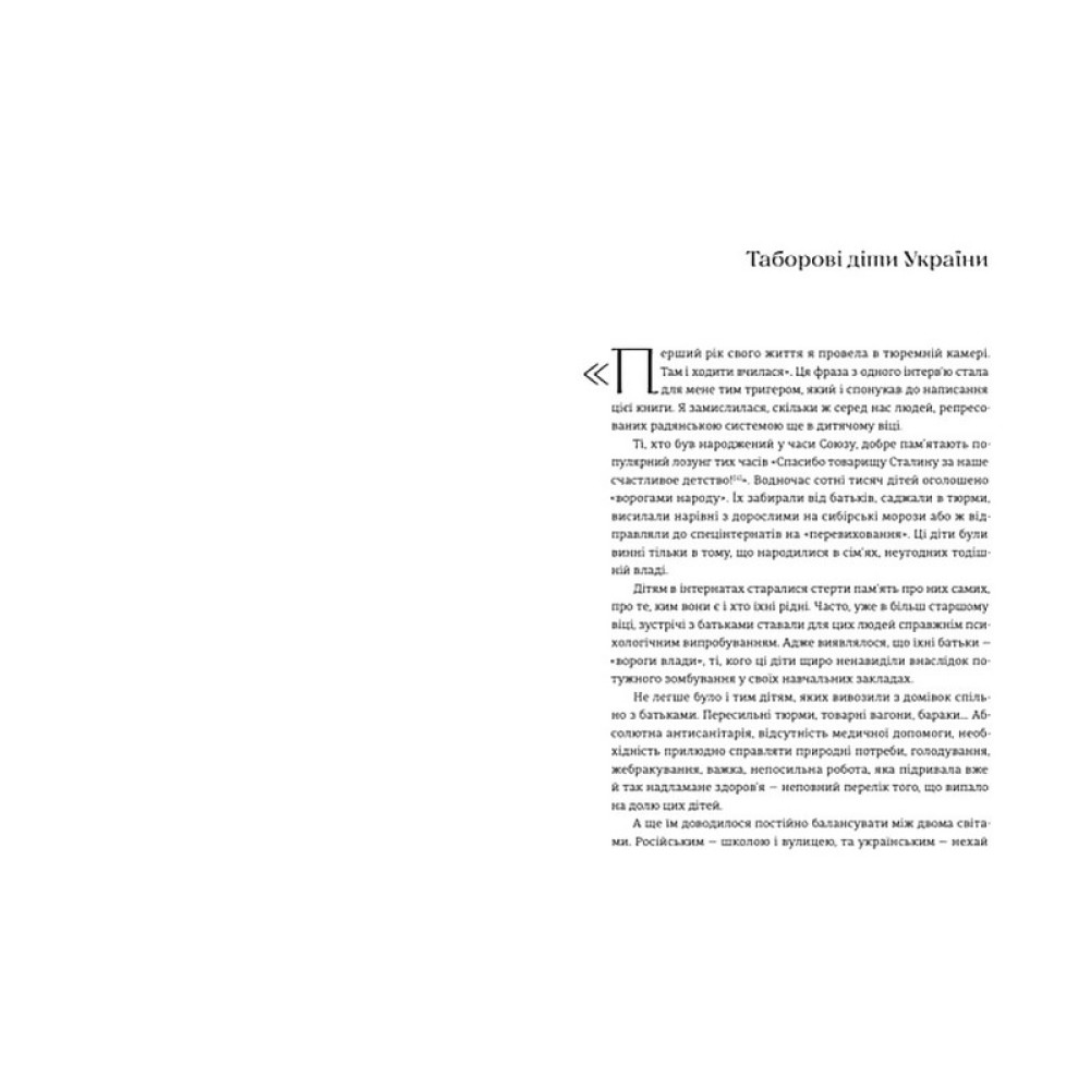 У книзі «Таборові діти» зібрано свідчення людей, які в дитячому віці зазнали репресій радянської каральної системи. Це розповіді тодішніх дітей про те, як їх під дулами автоматів забирали з дому, про досвід перебування в тюрмах, про важку дорогу на сибірські морози в товарних вагонах, про життя в бараках чи спецінтернатах, про виживання в нелюдських умовах заслання. Ці свідчення варто прочитати, щоб знати, як ставилася радянська влада до дітей, яких оголосила «ворогами народу».