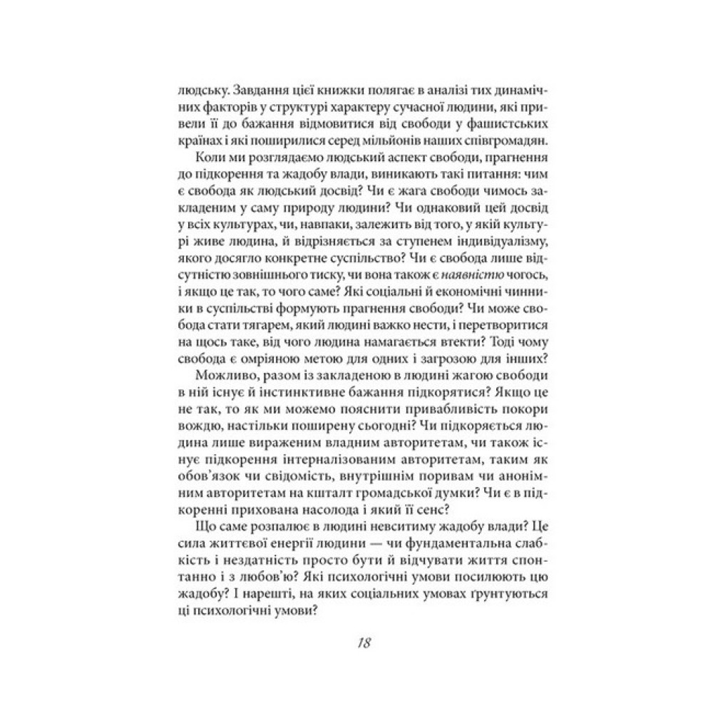 Еріх Фромм — видатний німецький філософ і психоаналітик, один із засновників неофройдизму, автор книжки «Мистецтво любові» та ще низки праць, які вважаються класичними у психології.Основоположник психоаналізу Зиґмунд Фройд говорив: «Більшість людей насправді не хочуть свободи, тому що вона передбачає відповідальність, а відповідальність лякає людей». Може, тому втеча від свободи цілком прийнятна для більшості? Еріх Фромм розкриває перед читачем саму суть свободи, чим вона є для сучасної особистості. Чи існує зв’язок між авторитарними режимами та втечею від свободи? Як пояснити той факт, що деякі люди добровільно відмовляються від незалежності, віддаючи перевагу рабству й обираючи конформізм? Чому свобода може спричиняти почуття самотності, страху та безсилля? І чи справді свобода має дві форми — хорошу й погану? Еріх Фромм розглядає феномен свободи і відповідає на ці одвічні питання.