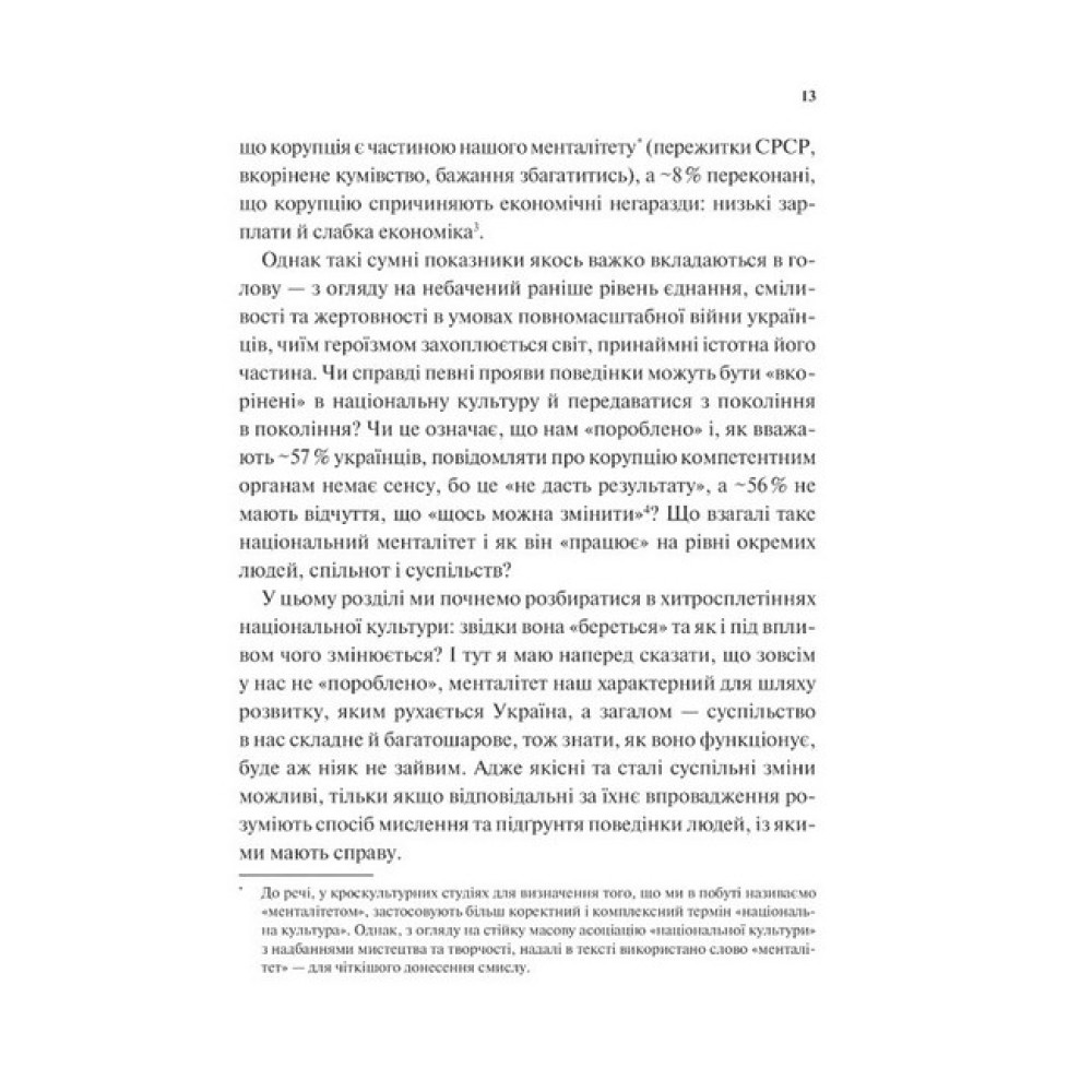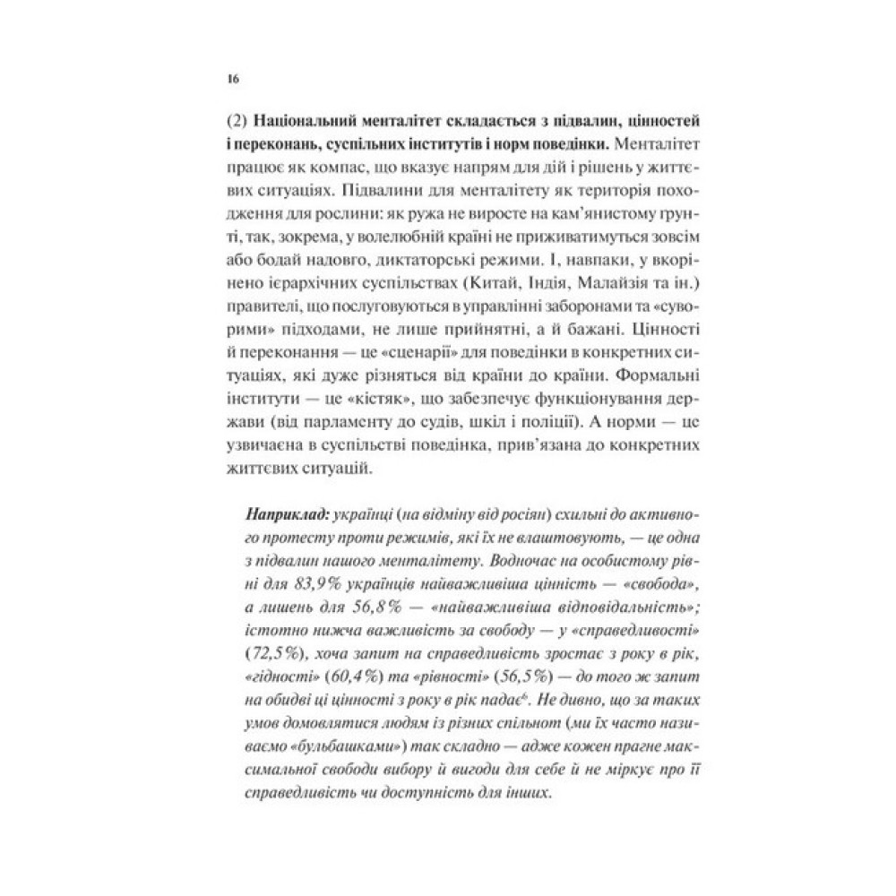 Чому корупція в Україні (хибно) вважається «непозбувною»? Яка причина того, що ми обираємо політиків певного типу й не довіряємо державі? Чому публічні дискусії у нас так часто перетворюються на «срачі»? Чи дійсно тут «пороблено» (насправді — ні) й системні зміни за західними шаблонами в Україні неможливі? Кроскультурна наука розкладає національні менталітети на типи, які можна порівнювати, і складові, які можна аналізувати без стереотипів та зайвих емоцій. Це перший подібний текст українського автора, який пояснює широкій читацькій аудиторії, хто ми такі, чому ми такі, які є, і як з цим жити.