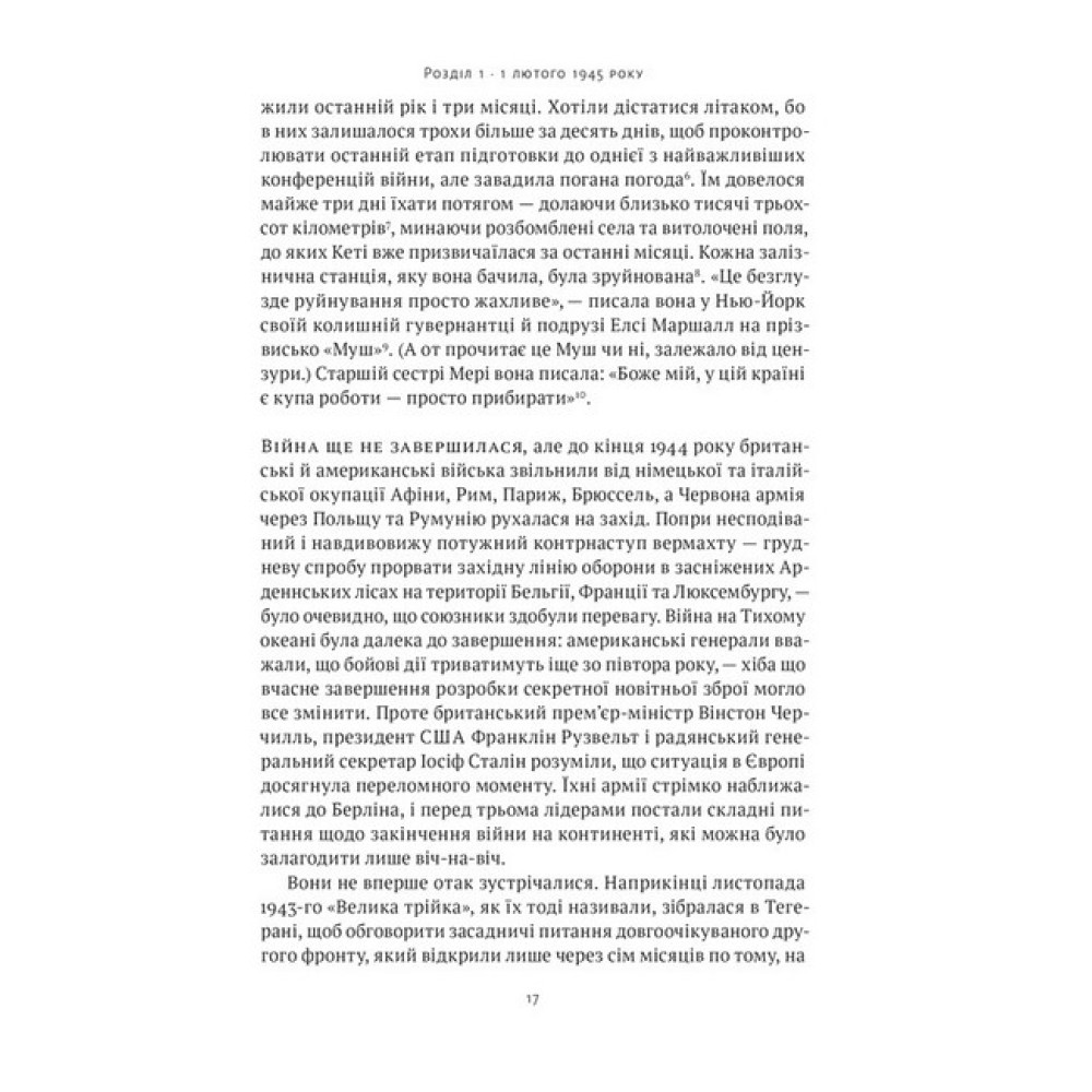 Ця історія — про Ялтинську конференцію очима жінок, які відвідали її зі своїми впливовими батьками. Сара Черчилль була акторкою, а згодом стала офіцеркою ВПС Британії. Анна Рузвельт — єдиною донькою президента і берегинею батькових таємниць. Кетлін Гарріман — чемпіонкою з лиж, військовою кореспонденткою і донькою посла США в Радянському Союзі. Що їх об'єднувало? Як вони впливали на батьківські рішення? Які романи яскраво забарвлювали їхнє перебування в Криму? А ще — чому на конференції не було доньки Сталіна? Кетрін Ґрейс Кац дає докладні відповіді на ці питання і ділиться подробицями про залаштунки політичного театру тих вирішальних для світу днів. Про авторку: Кетрін Ґрейс Кац — американська історикиня, випускниця Гарварду і Кембриджу. Здобуває ступінь доктора права в Гарвардській школі права. Авторка двох книжок з історії, і «Ялтинські доньки» — її успішний дебют як дослідниці та письменниці.