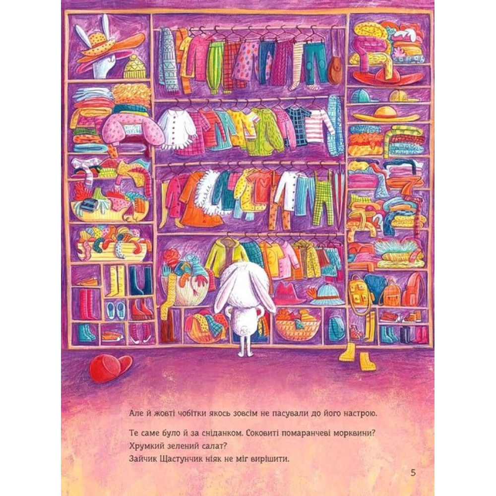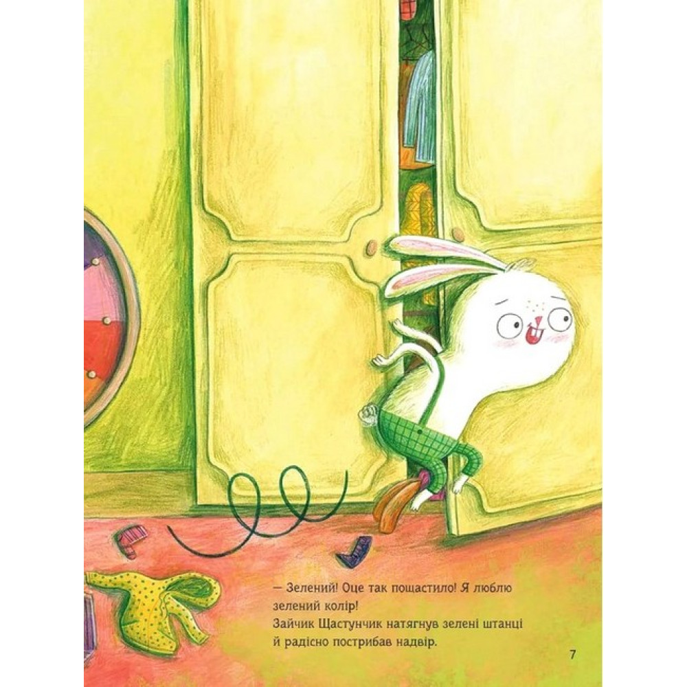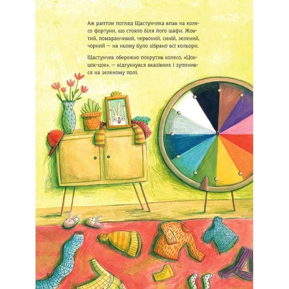 Зайчик Щастунчик зовсім не радий. Щодня йому доводиться вирішувати, що вдягти, з ким гратися й чим поласувати. Тому Щастунчик вигадує, що відтепер ухвалювати всі рішення за нього має колесо фортуни: синій колір на користь синього шалика, лохини на обід і веселощів із павичем. Зелений — на користь зелених штанців, соковитої трави на перекус і стрибків наввипередки з коником. Але чи щасливий тепер Щастунчик? Він чекає, щоб випав помаранчевий! Адже тоді нарешті буде морква й можливість пограти у футбол із білочкою. Раптом Щастунчик усвідомлює, що насправді щасливим його робить… СТРОКАТІСТЬ!