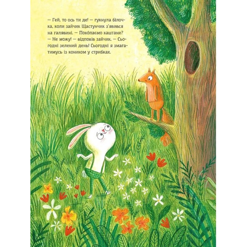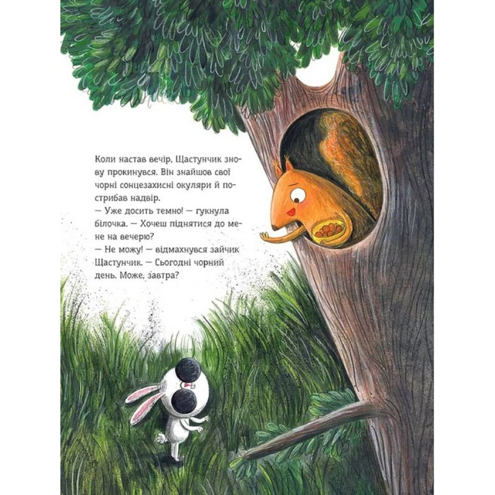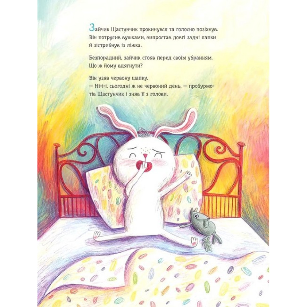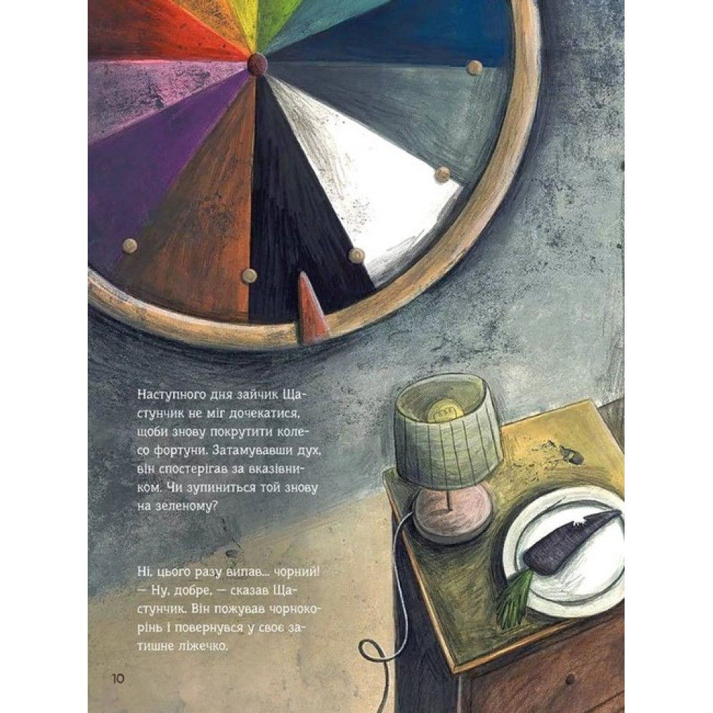 Зайчик Щастунчик зовсім не радий. Щодня йому доводиться вирішувати, що вдягти, з ким гратися й чим поласувати. Тому Щастунчик вигадує, що відтепер ухвалювати всі рішення за нього має колесо фортуни: синій колір на користь синього шалика, лохини на обід і веселощів із павичем. Зелений — на користь зелених штанців, соковитої трави на перекус і стрибків наввипередки з коником. Але чи щасливий тепер Щастунчик? Він чекає, щоб випав помаранчевий! Адже тоді нарешті буде морква й можливість пограти у футбол із білочкою. Раптом Щастунчик усвідомлює, що насправді щасливим його робить… СТРОКАТІСТЬ!