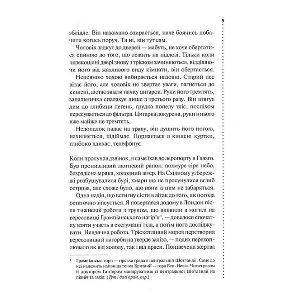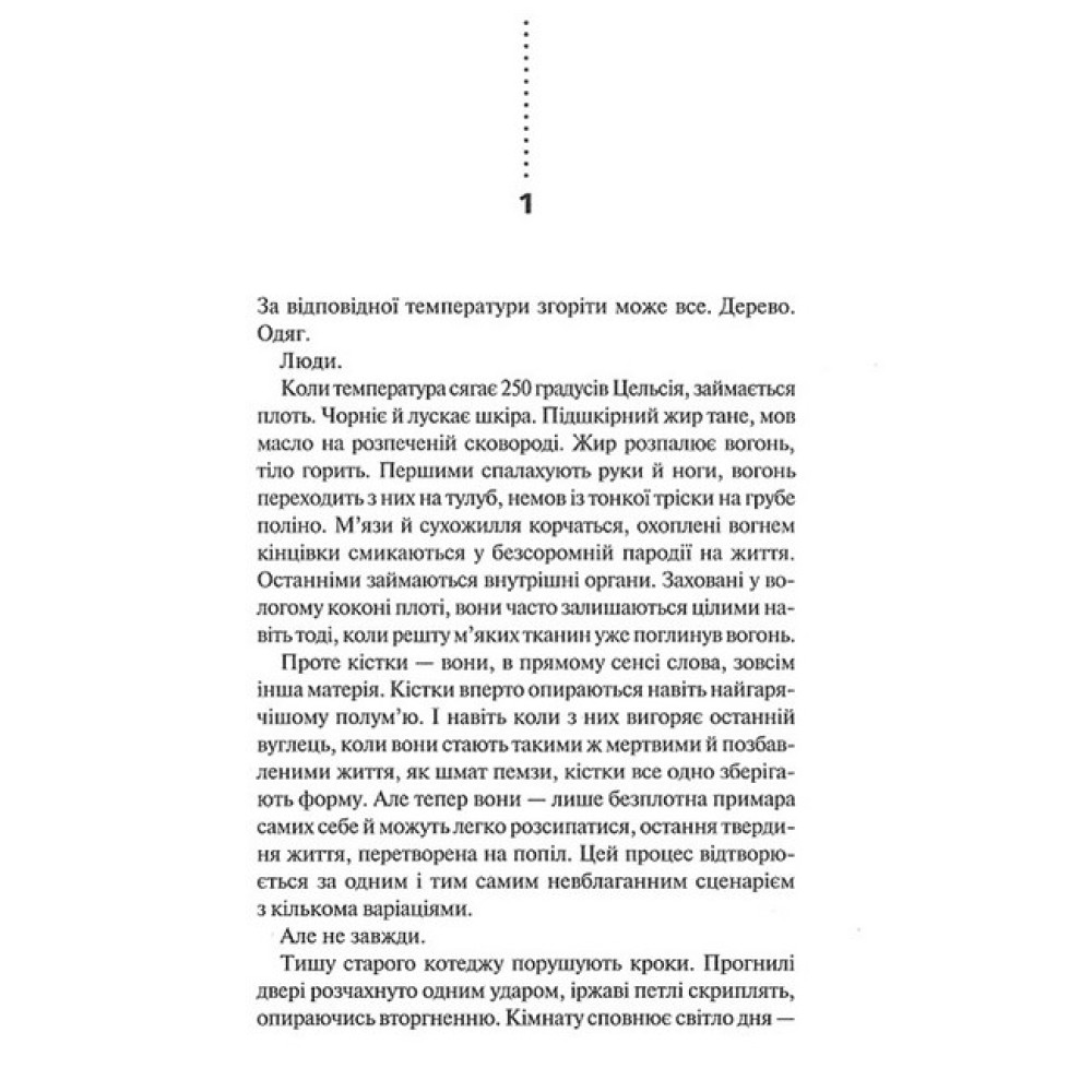 Чи можна за самими лише обгорілими рештками тіла визначити, було це навмисне вбивство чи нещасний випадок? Кримінальний антрополог Девід Гантер, якого викликали на місце злочину під час відпустки в Шотландії, впевнений, що так. Однак складно розплутати справу без додаткових доказів. І лише коли хтось намагається знищити свідчення злочинів у нових пожежах, стає зрозуміло, що жертву вбито, а злочинець — один із присутніх на острові. Ба гірше: саме напередодні жахливої знахідки потужний шторм відрізав острів від зовнішнього світу. Хто в закритій спільноті міг вчинити таке звірство? Чи будуть ще жертви? Тривога шириться серед мешканців острова, неначе той вогонь, і лише Девід Гантер та відставний інспектор Броуді можуть покласти цьому край, добравшись до правди…