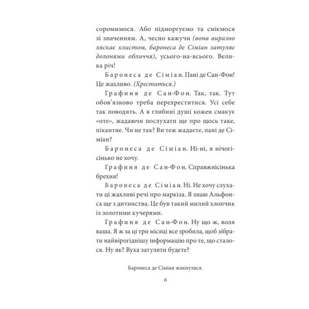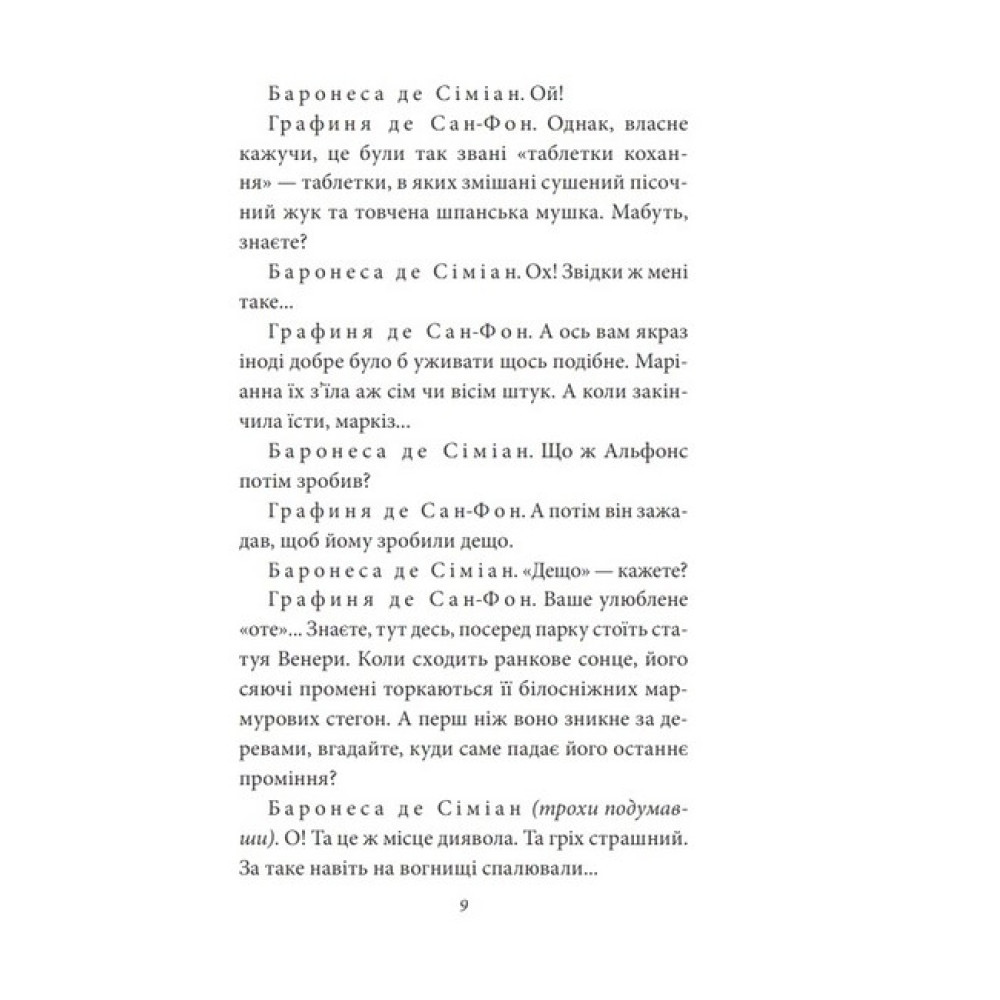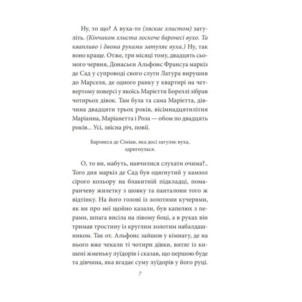 «Жінка маркіза де Сада» — найуспішніший драматичний твір Юкіо Місіми, який по праву вважається шедевром повоєнної театральної драми. Автор досліджує через серію дебатів між шістьма жінками складну постать маркіза де Сада, визнаного взірцем пороку. Місіма пропонує власну інтерпретацію того, що він вважав однією з центральних таємниць у житті цей сумнозвісній особи. Він описує історію непохитної підтримки Рене де Сад свого чоловіка, коли той був у в’язниці, і її раптового рішення відректися від нього після його звільнення.