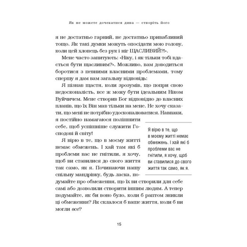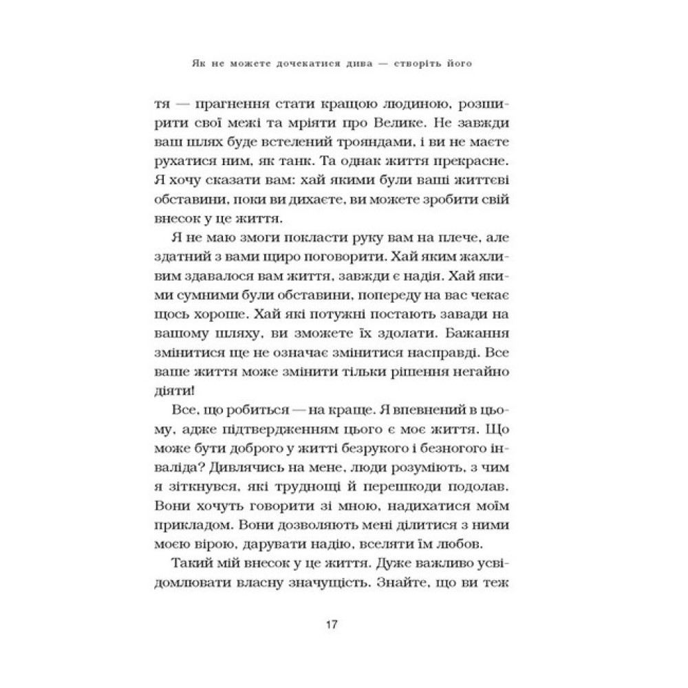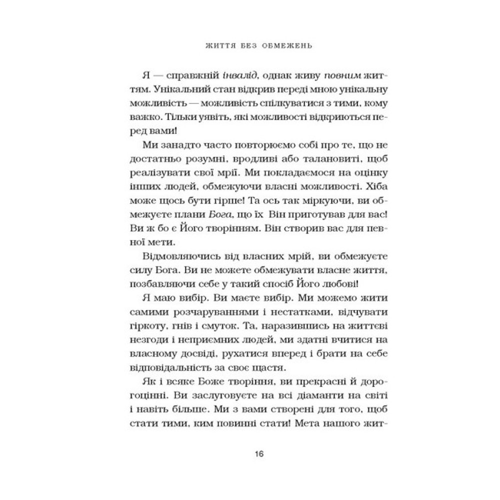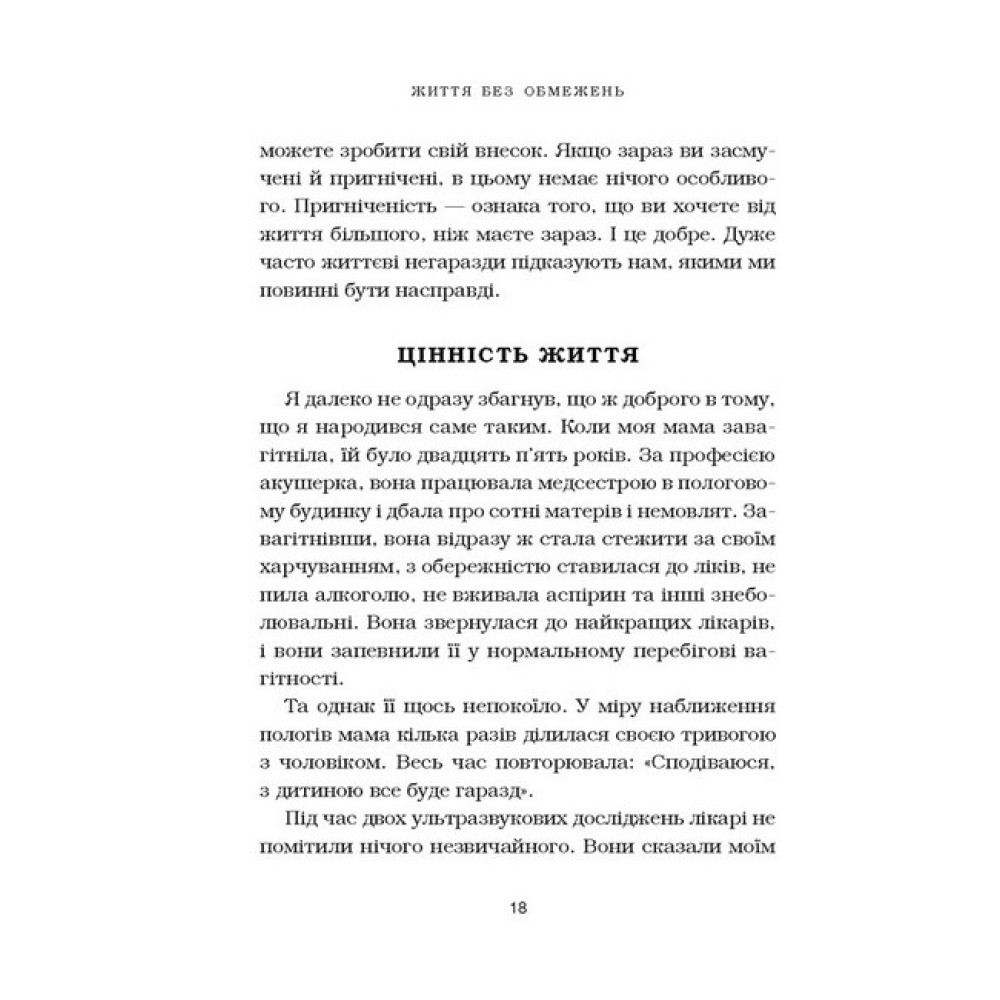 Нік Вуйчич народився без рук і ніг, однак живе незалежним, повноцінним, насиченим життям: здобув дві вищі освіти, самостійно друкує на комп’ютері зі швидкістю 43 слова за хвилину, займається серфінгом, грає у гольф, захоплюється риболовлею і навіть пірнає з трампліна у воду.Його книжка — емоційна й надихаюча розповідь про те, як здолати відчай, злигодні, повірити в себе й стати щасливим. Нік відверто розповідає про свої фізичні проблеми й переживання, про те, яких зусиль йому довелося докласти, щоб змиритися зі своїм станом, — була мить, коли він хотів вкоротити собі віку. Спливло багато часу, перш ніж він навчився бачити у своїх проблемах не лише заваду, а й можливість розвитку, ставити перед собою велику мету й завжди здобувати бажане. Без рук і ніг він навчився підніматися у всіх сенсах цього слова. У своїй книжці Нік сформулював правила життя, які допомогли йому, тепер ними він ділиться з читачами.