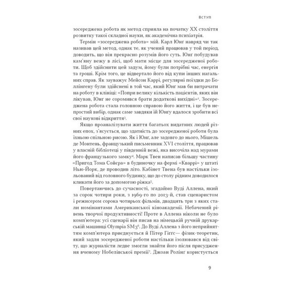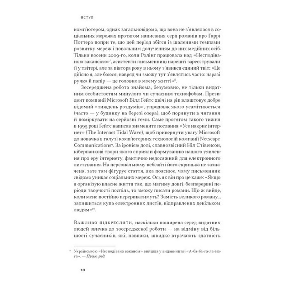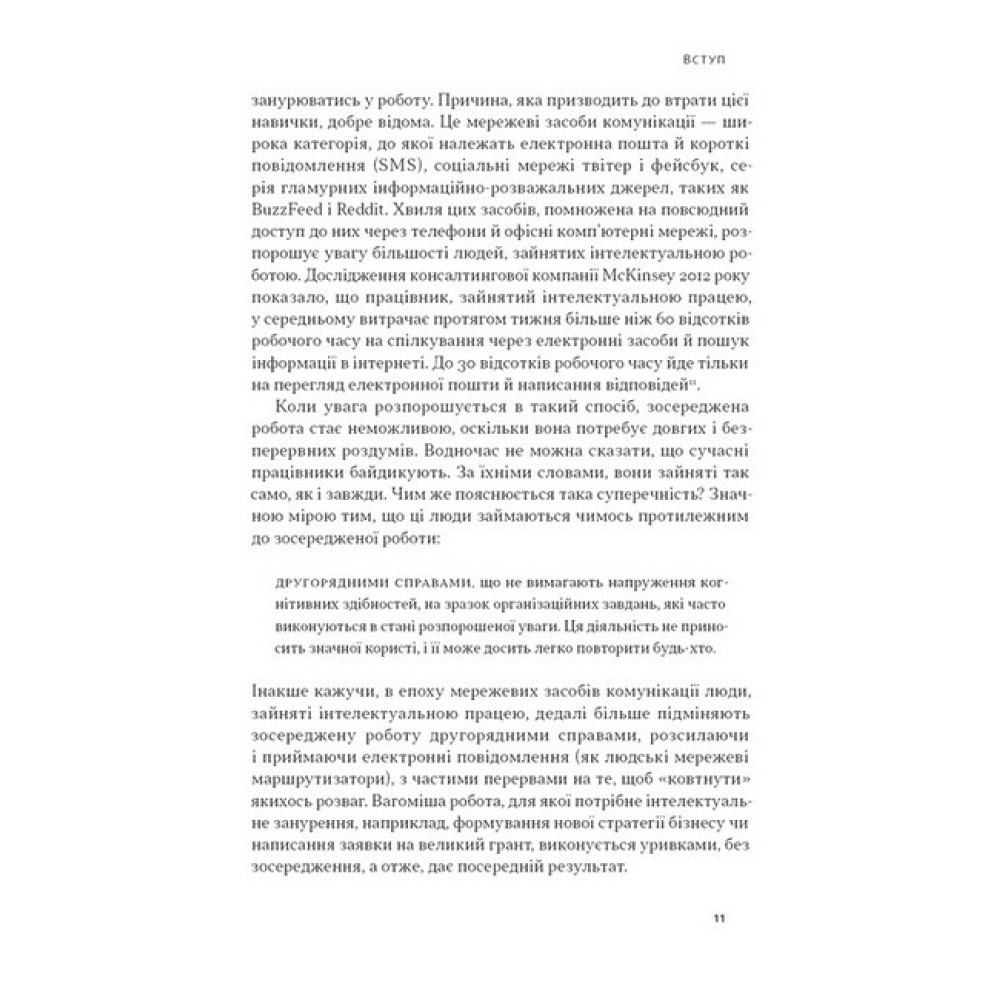У сучасному світі справжня винагорода чекає не на тих, хто може вправно користуватися соцмережами. Цього легко навчитися. Особливими стають ті, що здатні глибоко мислити та створювати унікальні ідеї. Для цього, переконує автор, важливо вміти занурюватися у завдання та фокусуватися.Автор дає поради, як зробити глибоке фокусування основою для виконання будь-яких завдань, дозовано сприймати інформацію, розумно користуватися соціальними мережами, змінити свої звички, щоб концентруватися на роботі та досягати успіху.Для найширшого кола читачів, всіх, хто прагне кар’єрного та особистісного зростання.Кел Ньюпорт — професор комп’ютерних наук Джорджтаунського університету, письменник, автор популярного блогу про саморозвиток Study Hacks.