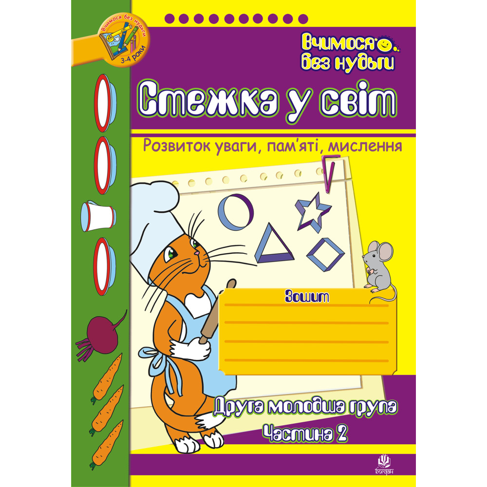 Пропонований посібник із серії “Вчимося без нудьги” містить систему завдань і вправ для розвитку уваги, пам’яті, мислення та творчої уяви дітей 3-4 років. Змістове наповнення і структура зошита допоможе дорослим у невимушеній, ігровій формі навчити малюків розрізняти предмети за формою, кольором, розміром, орієнтуватись у просторі та встановлювати взаємозв’язки між предметами й величинами. Для вихователів дитячих дошкільних закладів, батьків, логопедів.